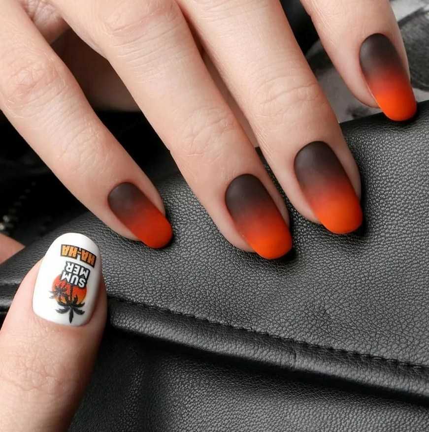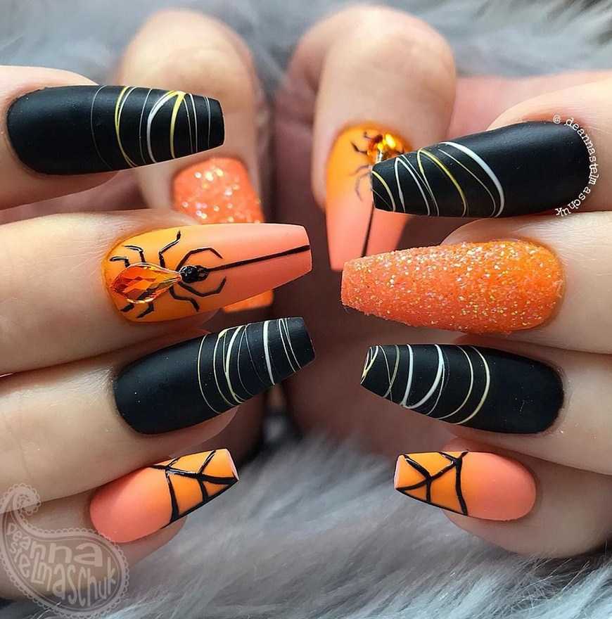 Особенно популярна комбинация черного и оранжевого на ногтях в Хэллоуин. Очень интересно смотрятся черно-оранжевые ногти в матовом исполнении.