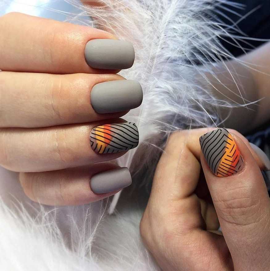 Серый цвет сглаживает чрезмерную яркость любого лака, даже неонового. Его добавляют, чтобы успокоить маникюр, сделать более лаконичным. Для офисного нейл-арта лучше выбрать матовые вариации лаков.