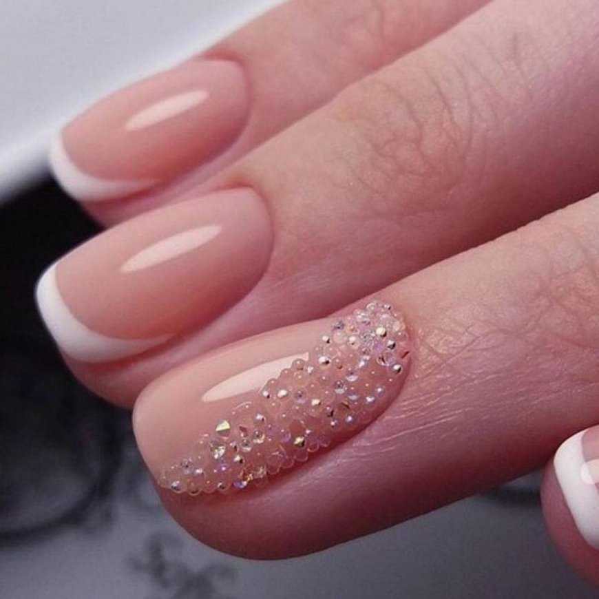 Дизайн ногтей с камнями и стразами на прозрачной нюдовой основе отлично подойдет для праздника или какого-то особенного торжества, с таким маникюром ваш образ будет смотреться еще шикарнее и эффектнее.