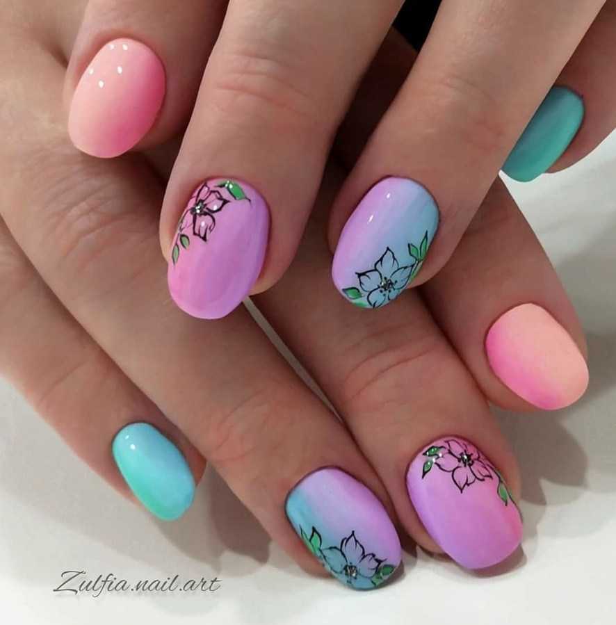 - Флористика — на мягких деликатных тонах орнамент с цветами будет выглядеть очень женственно. Она выполняется художественной росписью, стемпингом или самым простым способом — нанесение наклеек-слайдеров;