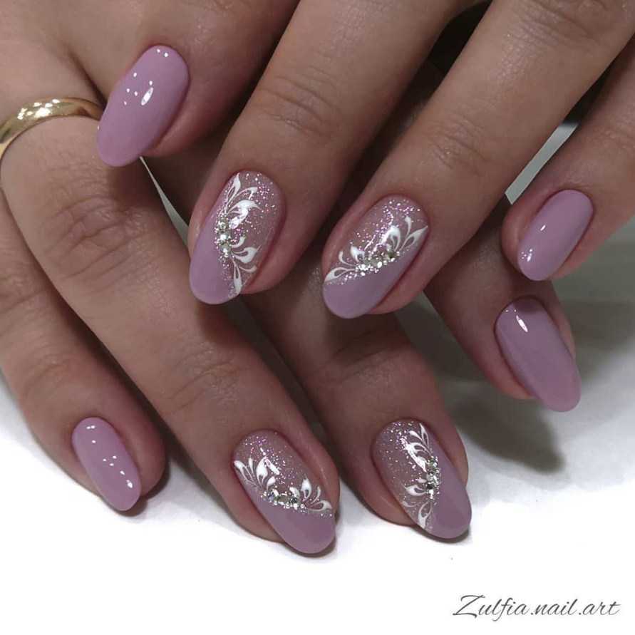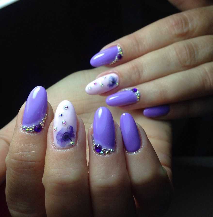 Элегантную красоту маникюра в лавандовых тонах подчеркнет инкрустация. Маленькие кристаллы внесут нотку шика. Чтоб дизайн был более впечатляющем лучше использовать матовое покрытие, на нем стразы смотрятся акцентнее.