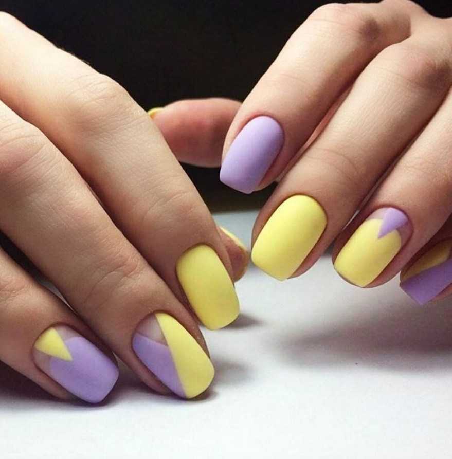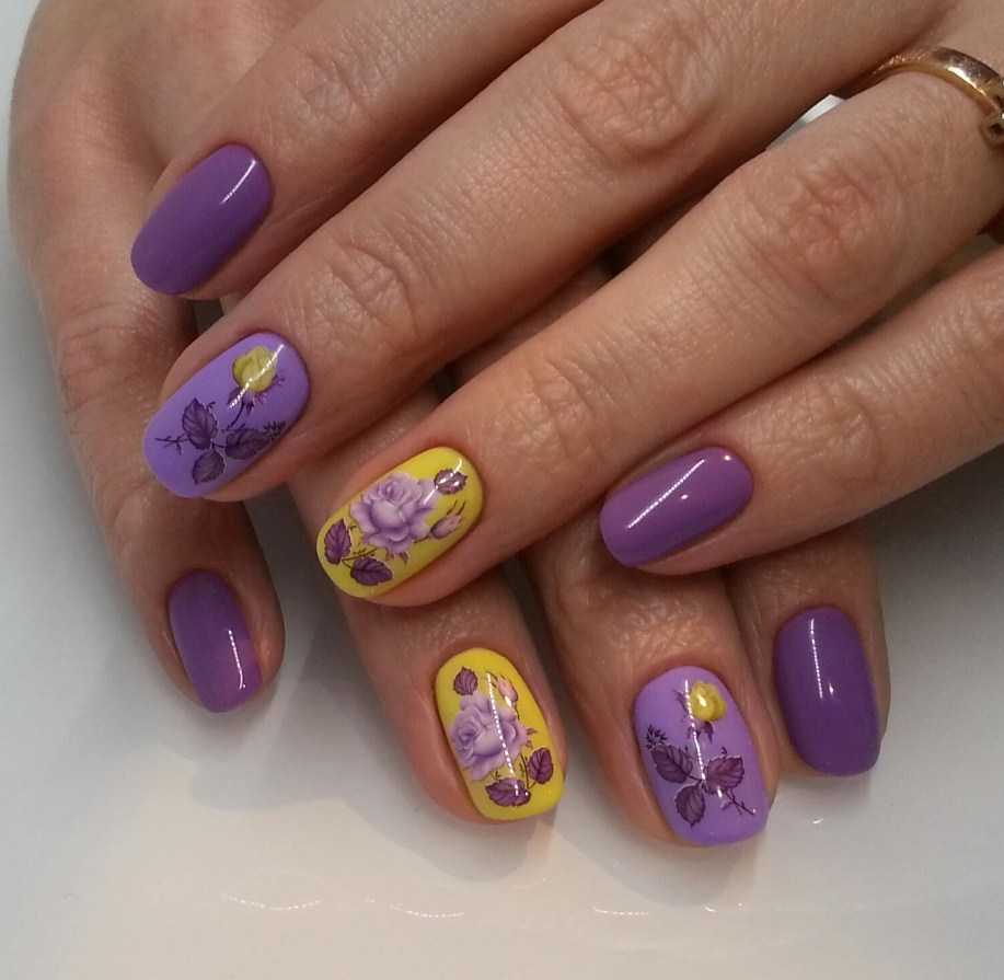 Лиловый маникюр в комбинации с оранжевымЛиловый маникюр в комбинации с желтым цветом