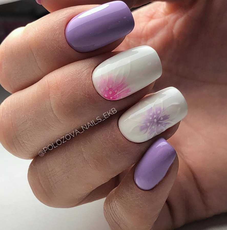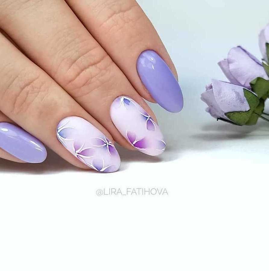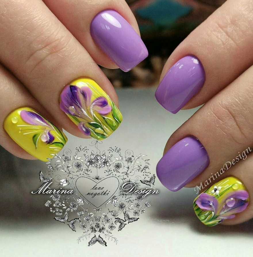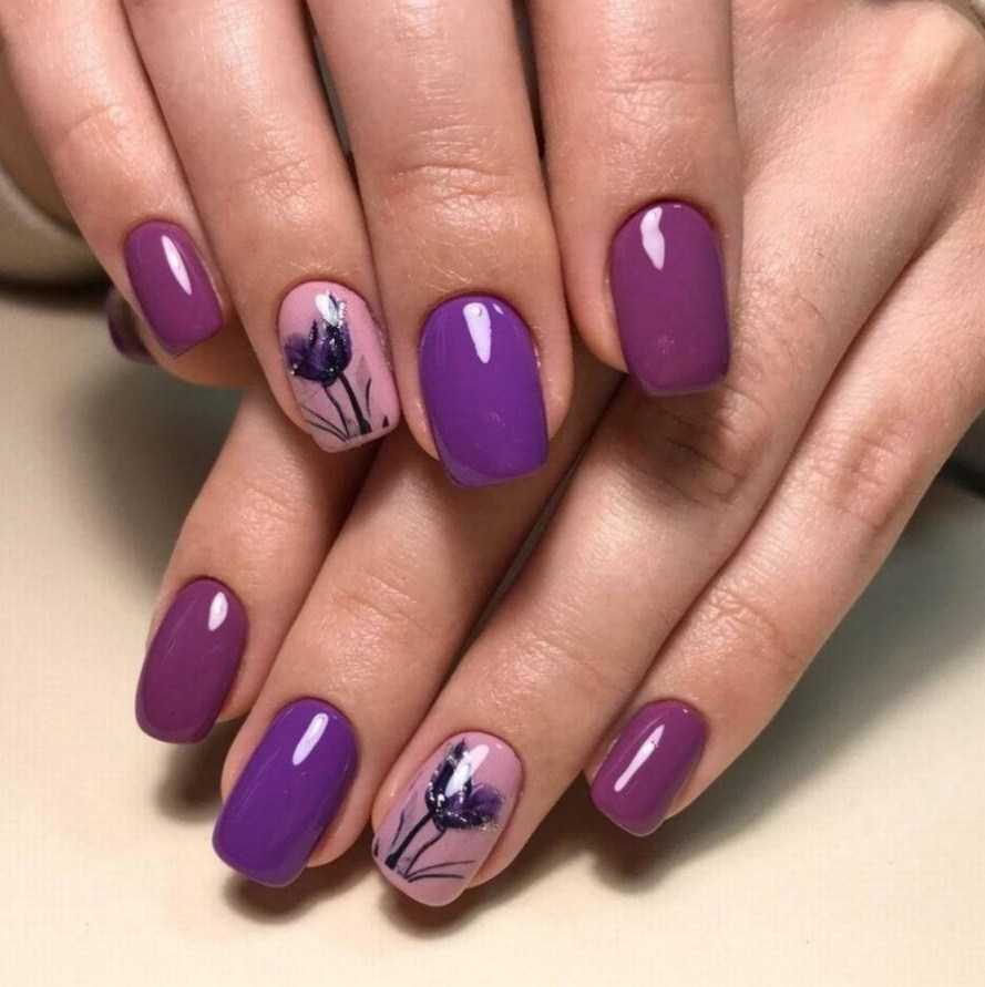 Сирень, фиалки, ирисы и другие фиолетовые цветы служат идеальным дополнением для белой и нюдовой базы. Кроме того, красиво будут смотреться контрастные флористические узоры, нарисованные на фиолетовым фоне.