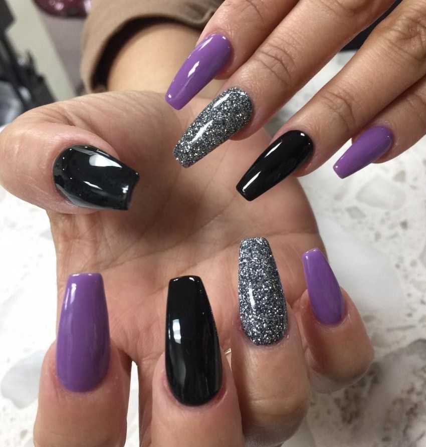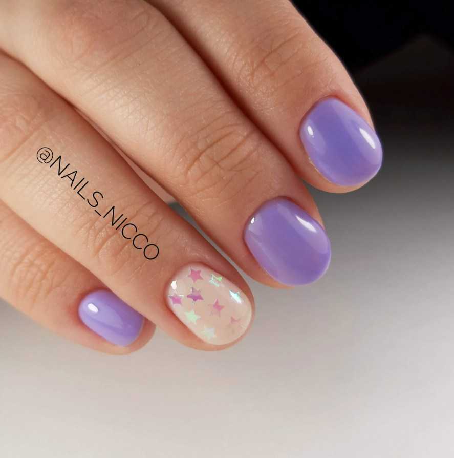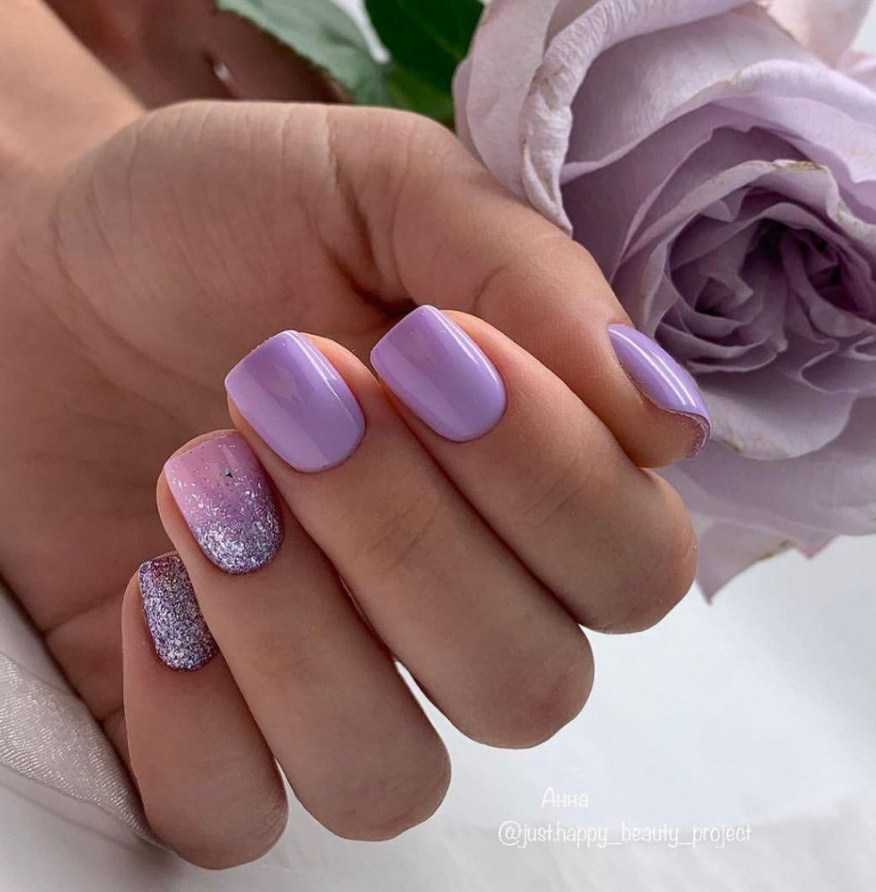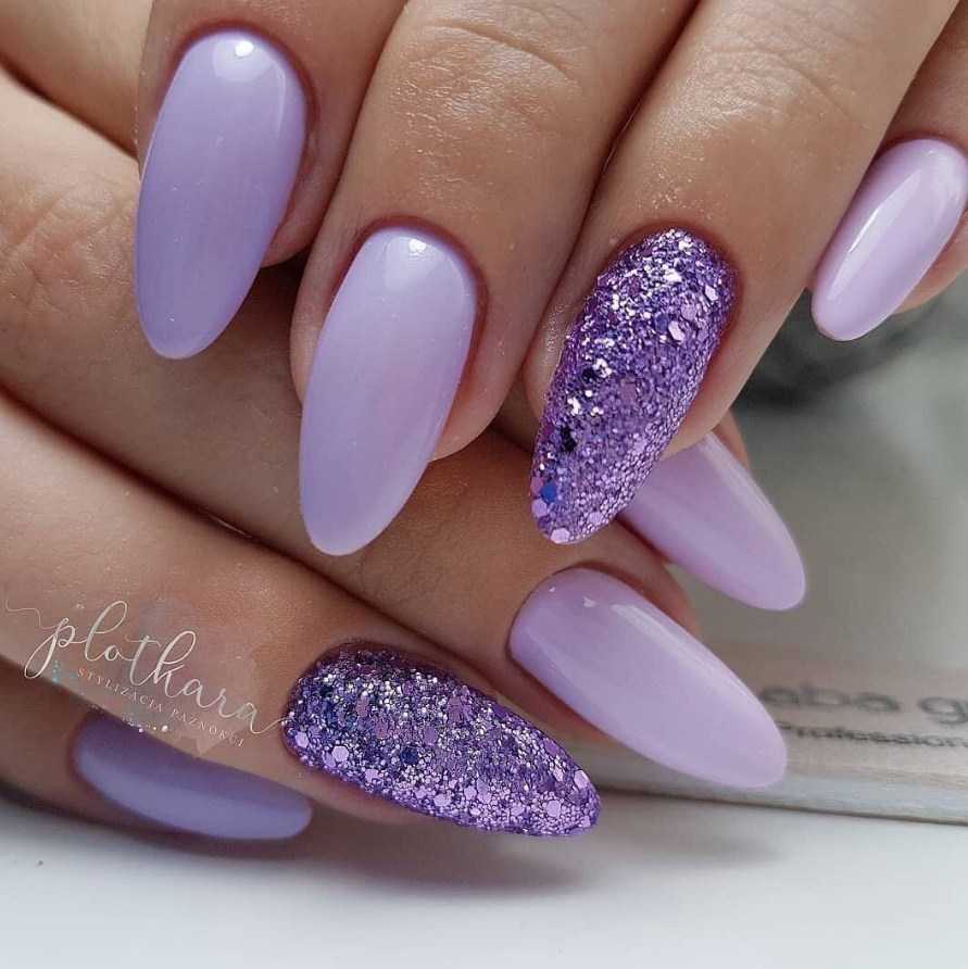 Лавандовые ногти будут выглядеть еще нежнее с добавлением блесток. Сейчас существует множество их разновидностей: от привычных мелких, почти пылинок, золотого и серебряного цвета, до всевозможных круглых, ромбовидных, имеющих различные переливы, включая эффект хамелеона — пайеток.