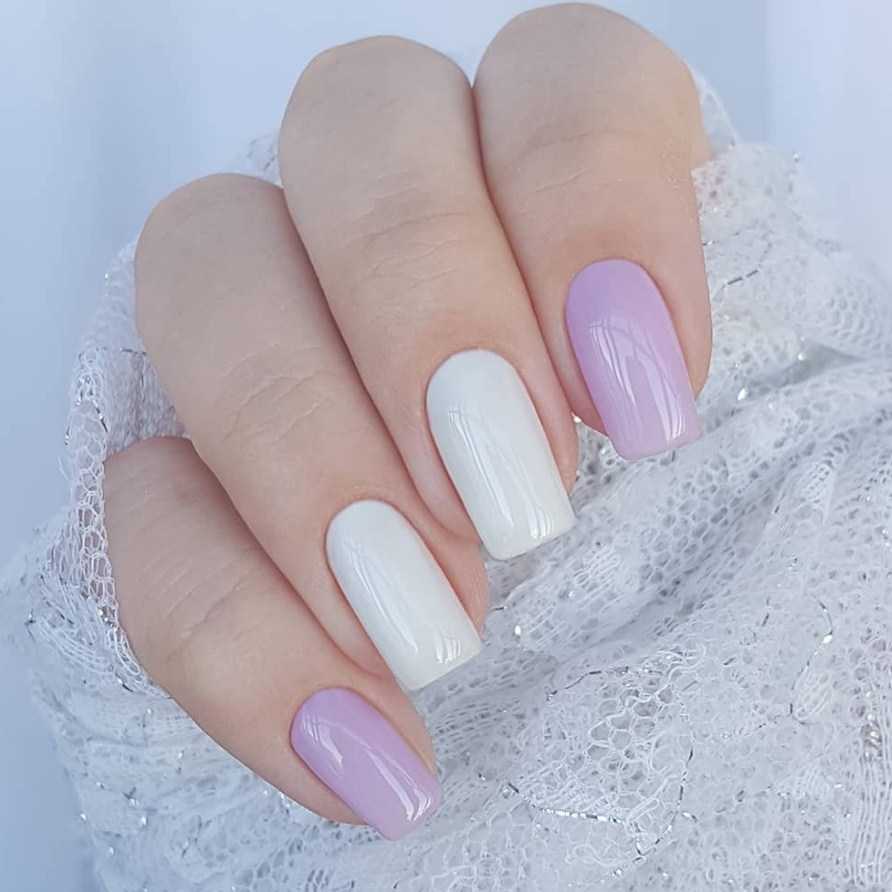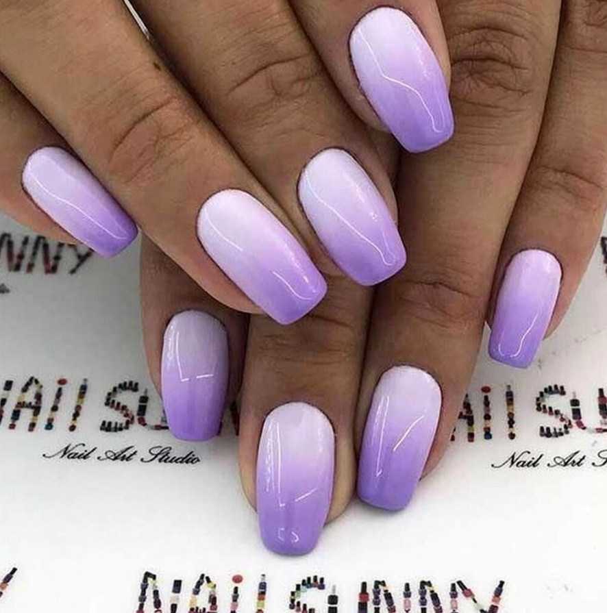 Переход из светло-лавандового в белый делает невесомыми ногти. Вы также можете объединить в градиенте несколько оттенков фиолетового, сделав стильный дизайн, который будет гармонично выглядеть с любым стилем одежды.