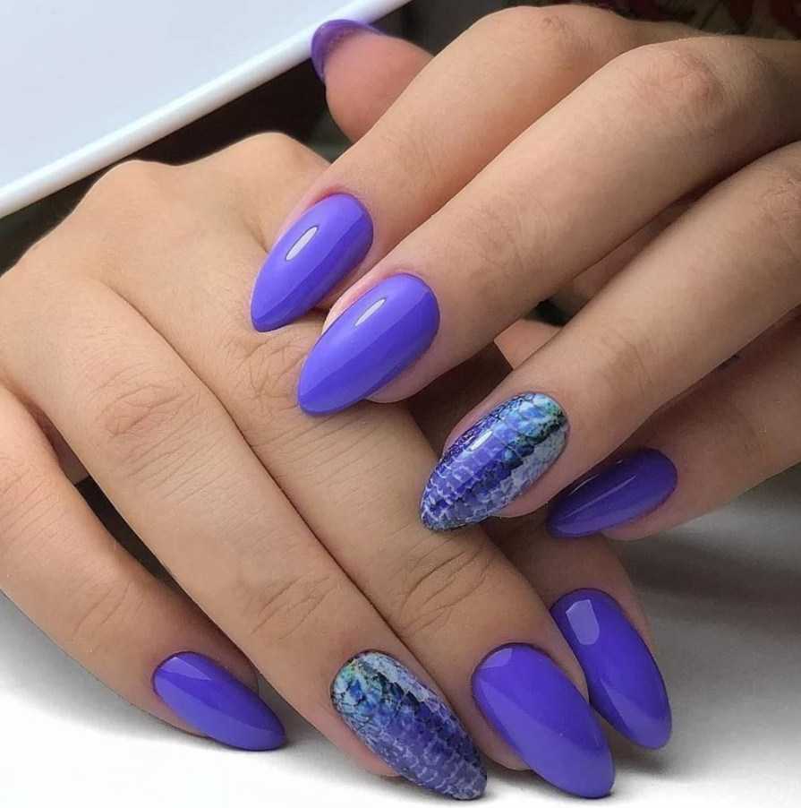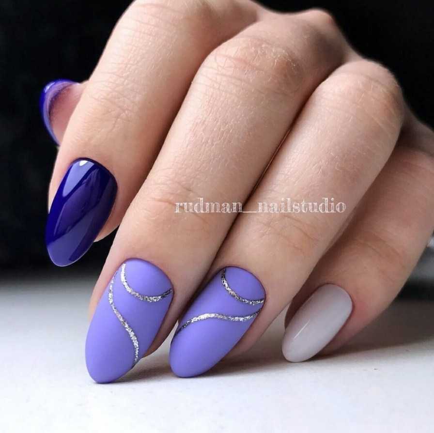 Приглушенные оттенки синего гармонично сочетаются с любым оттенком лилового, яркие тона стоит подбирать аккуратно, чтобы избежать эффекта «забивания» цветов друг другом. Голубые пастельные тона удачно смотрятся с лиловыми оттенками, объединяясь в эффектный геометрический маникюр, френч, точечный дизайн и т.п.