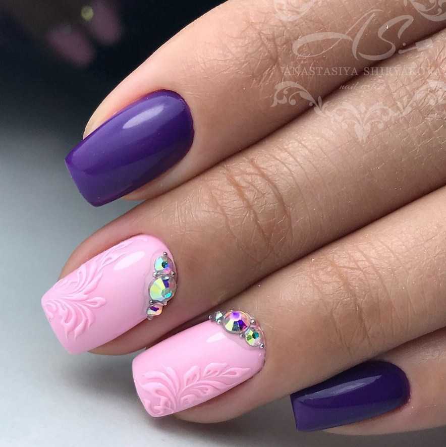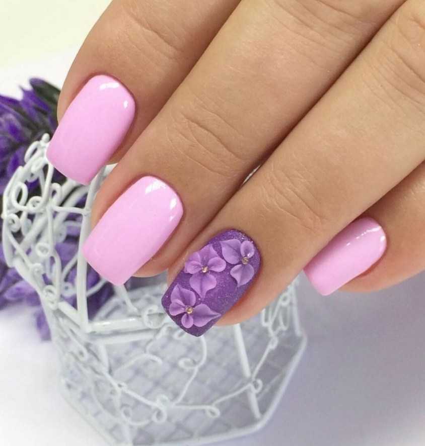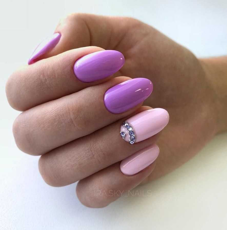 Нежные оттенки сиреневого (лилового) оптимально сочетаются к близким к ним тонам розового. Соответственно насыщенные цвета хорошо сочетаются с такими же яркими вариантами или темными оттенками. Объединятся сиреневый с розовым может в разных техниках маникюра, дополнятся декором аналогичных цветов или яркими элементами под золото, серебро и т.д.
