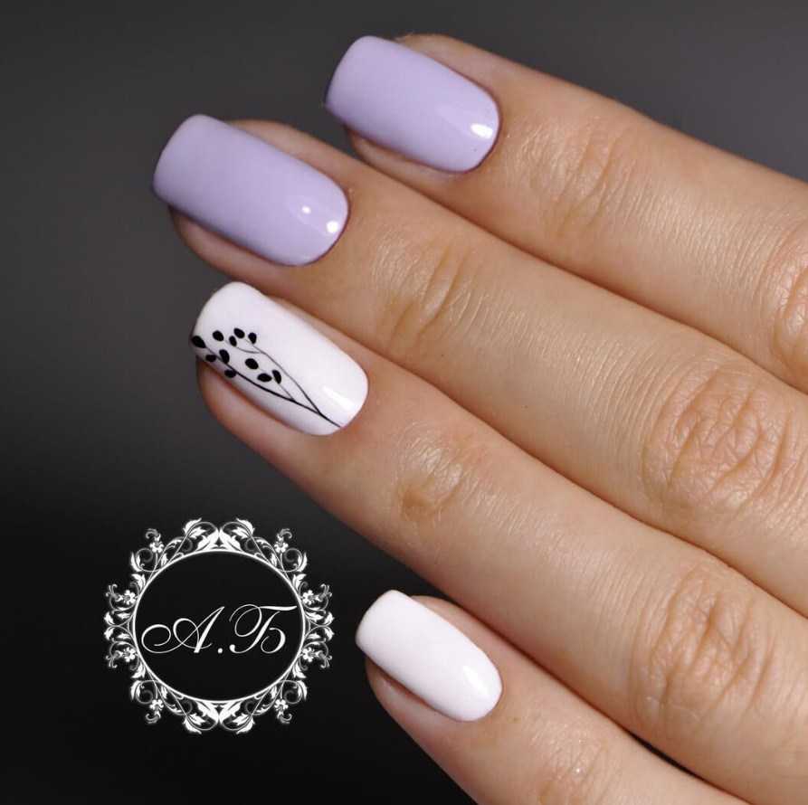 Комбинация лаванды и белого – одна из самых удачных и стильных. Она даёт очень гармоничное покрытие для ногтевых пластин, которое подходит для всех времён года. Зимой можно выполнить белым кружевные узоры или снежинки на нежном фиолетовом фоне, летом – сделать френч или лунный маникюр.