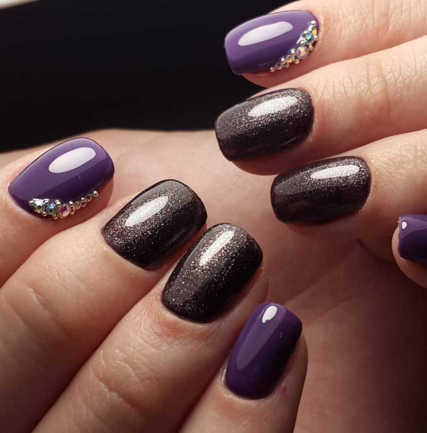 - С фиолетовым лаком сочетаются не только серебряные стразы, но и разноцветные камушки – зеленоватые, синие, бирюзовые, золотистые, и т.д.