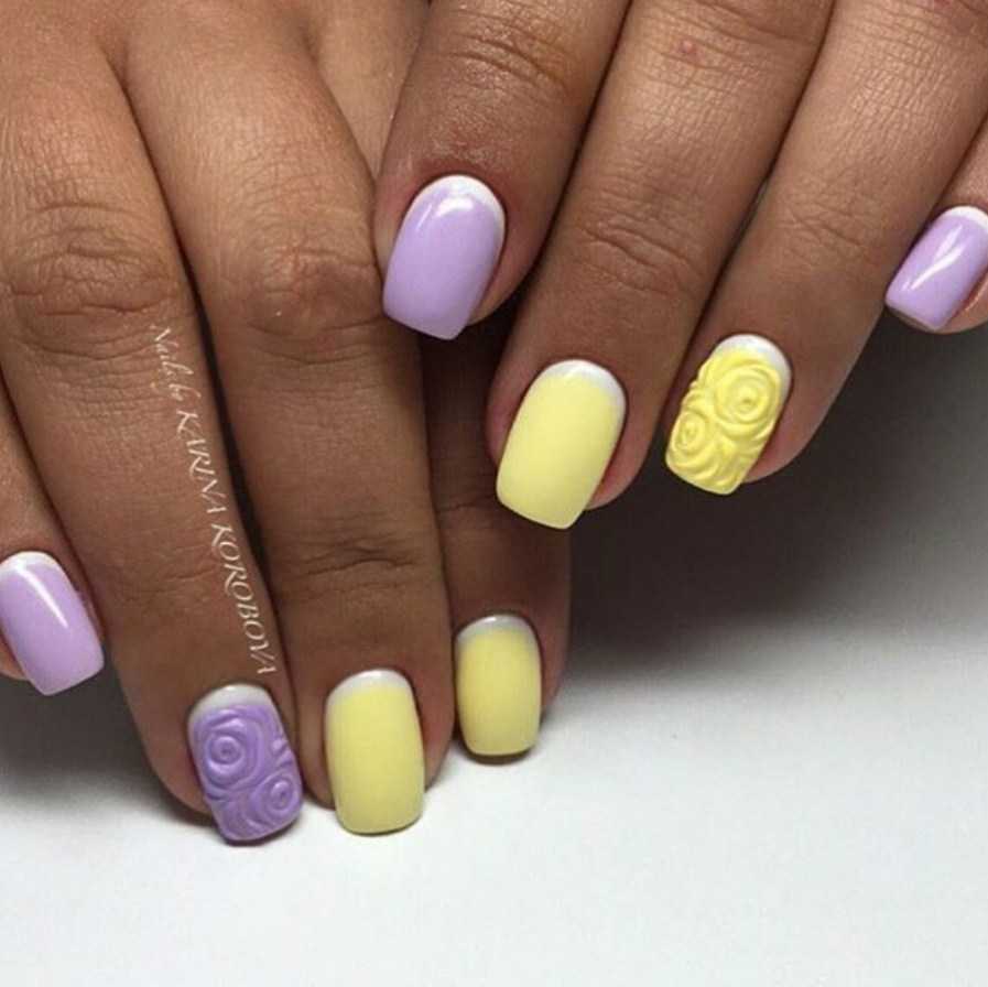 Сделать маникюр ярким и солнечным помогут оранжевые и желтые цвета. Лиловая основа хорошо с ними контрастирует, а сочетая эти оттенки вместе можно получить яркий сочный летний маникюр. При использовании пастельных оттенков и сочетая их в какой-либо технике, нейл-арт получается неброским и аккуратным.