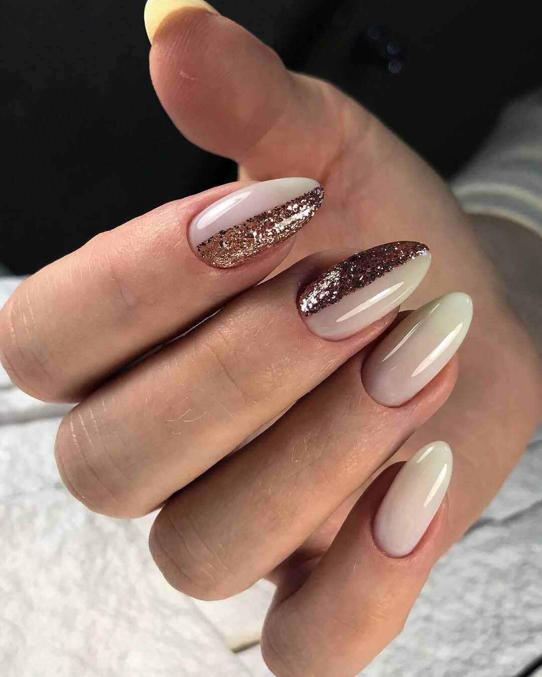 Нюд в сочетании с градиентом может удачно заменить классический френч. Цветовая гамма хорошо смотрится как на коротких квадратных ногтях, так и на длинных миндалевидных. Более яркий дизайн можно создать при помощи втирки — она придаст ноготкам шикарный мерцающий вид.