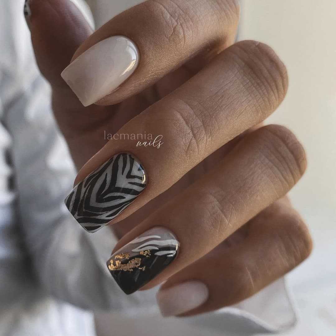 Это очень нежный и романтичный дизайн. Фаворитом здесь выступает бежевый цвет. Особым спросом будет пользоваться нюдовый маникюр с черными полосками и прозрачной лункой внизу ногтевой пластины, а оживить его можно при помощи ярких принтов.