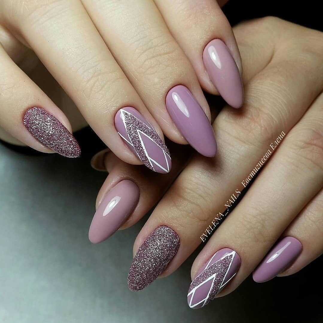 Геометрия всегда смотрится стильно и круто. Можно нарисовать ромбики, кружочки, треугольники или квадраты. Необычно будут смотреться зигзаги или рисунки, созданные с помощью линий разного размера. Для придания праздничного эффекта можно добавить блестки или стразы. С ними ваш маникюр будет выглядеть более ярко и современно.