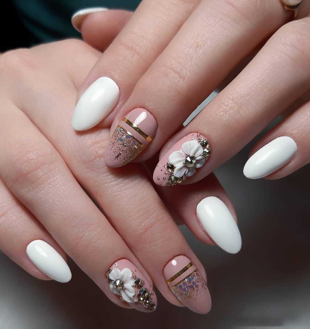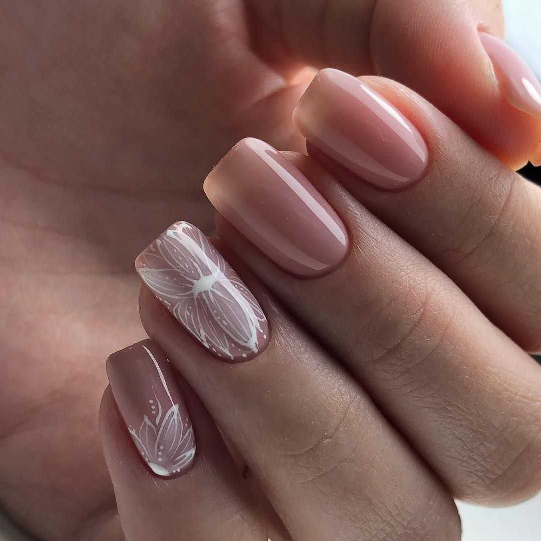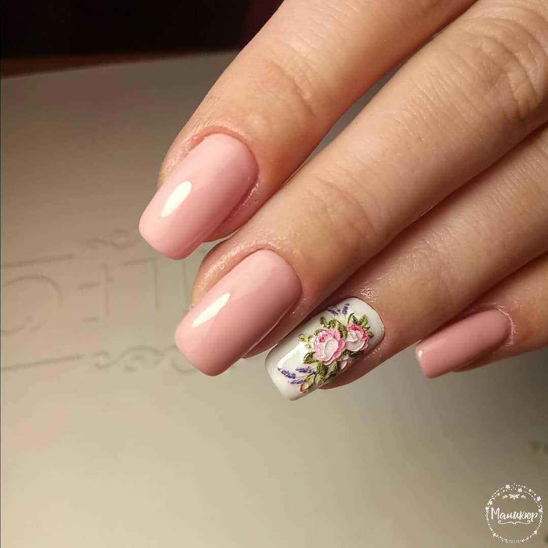Цветочные узоры приходятся по душе многим модницам. В тандеме с нюдовыми оттенками они смотрятся невероятно. Это лучший дизайн для весенне-летнего сезона. Попробуйте покрыть ногти нежно-розовым лаком и добавить сверху васильки или пионы. Рисунки можно нанести при помощи кисти, а еще проще использовать наклейки. Все зависит от ваших предпочтений.
