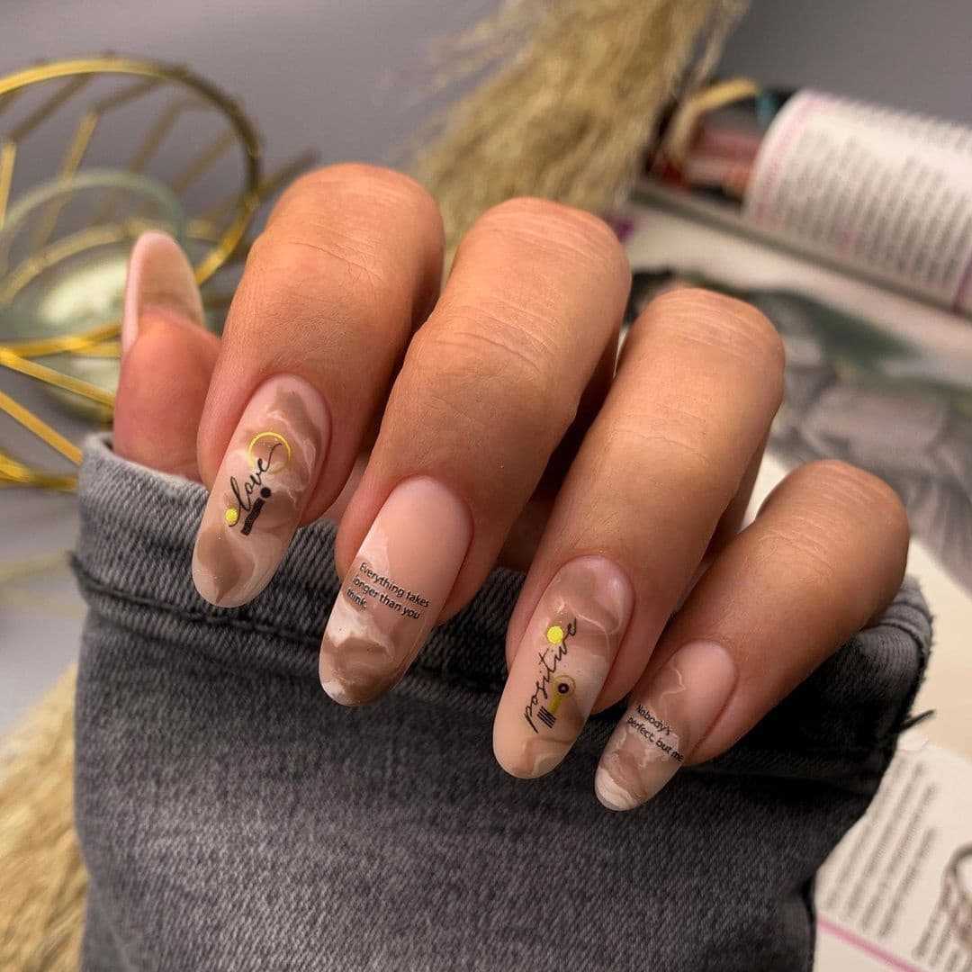 В прошлом году на пик популярности вернулись названия и эмблемы брендов, которые отображались везде и были главным акцентом в одежде. Профессионалы начали использовать больше слоганов на одежде. Мастера маникюра подхватили эту тенденцию. Идеально она будет представлена именно в 2021. Исключением для длинных ногтей станет именно такая смелая стилизация. Но правило «чем меньше, тем лучше» еще распространяется на этот тренд.