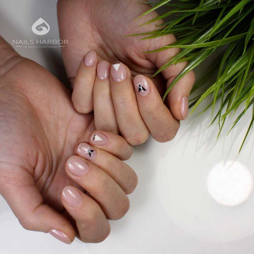 На коротких ногтях хорошо будет смотреться бесцветный, нежно-розовый. Дополнить их можно геометрическими узорами или полосками. Такой дизайн подойдёт к любому наряду.