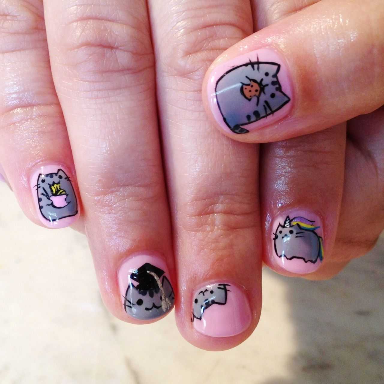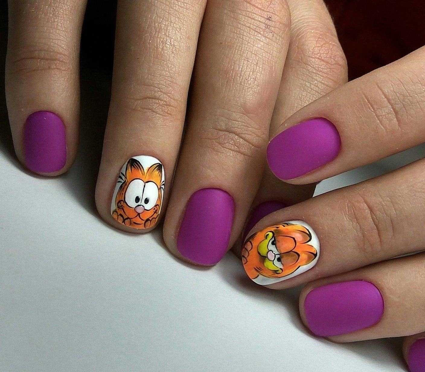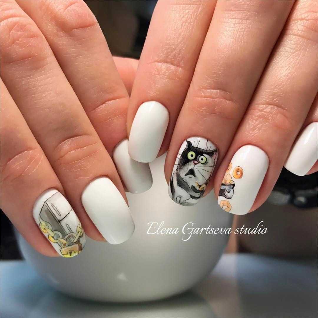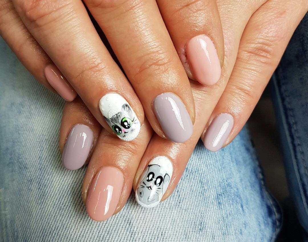 Отдельно стоит сказать о маникюре с мультяшными кошками. Например, особой популярностью пользуется изображение Чеширского кота или его улыбки. Еще интересные варианты — кот из мультика про Шрека или из мема про самого грустного кота в мире. Выбирайте любимый персонаж и переносите его на ноготки и ваш маникюр будет уникальным и привлекательным.