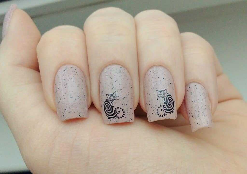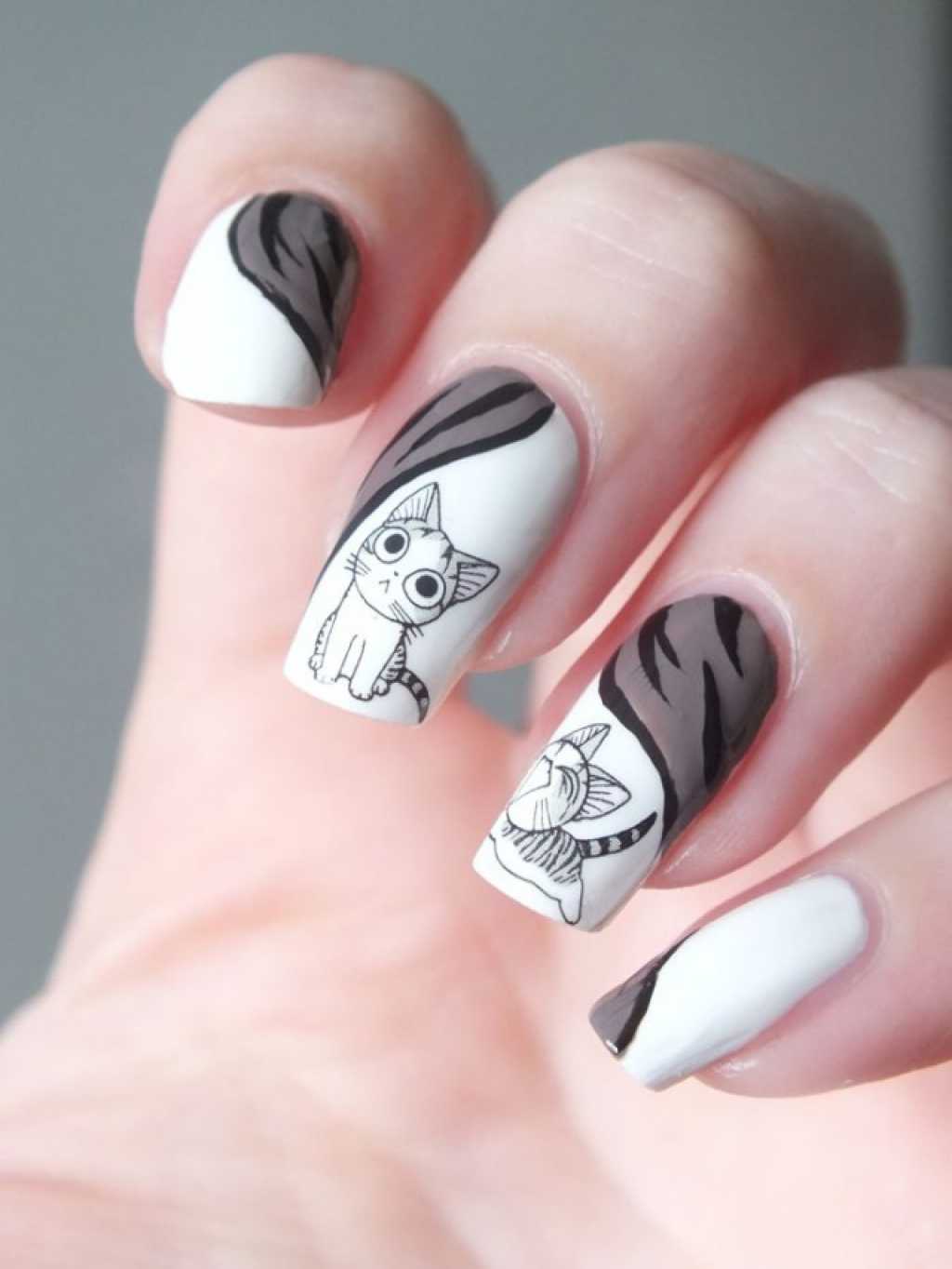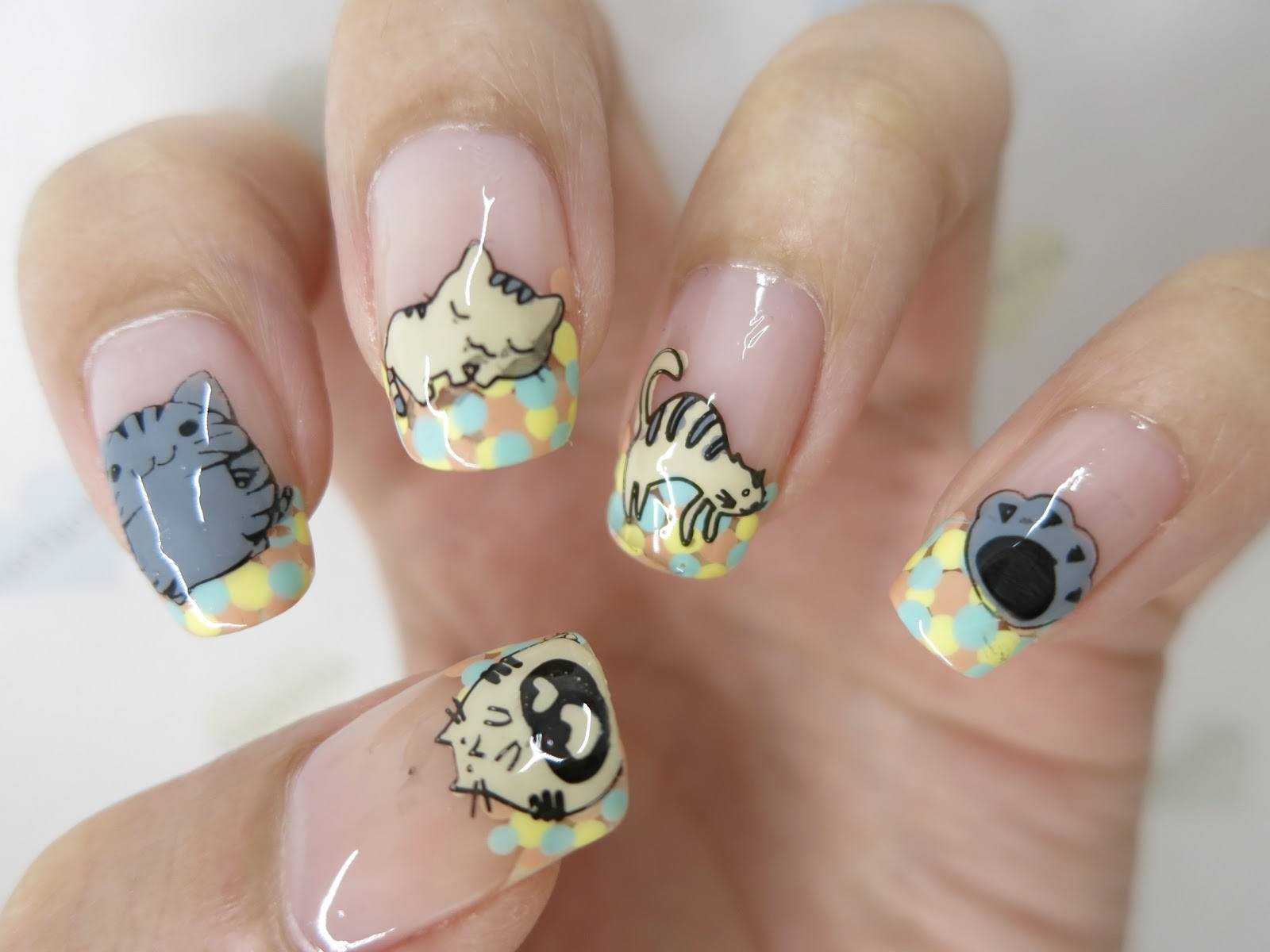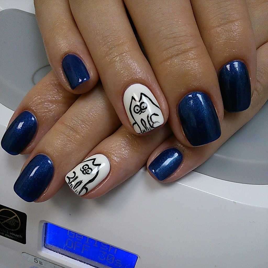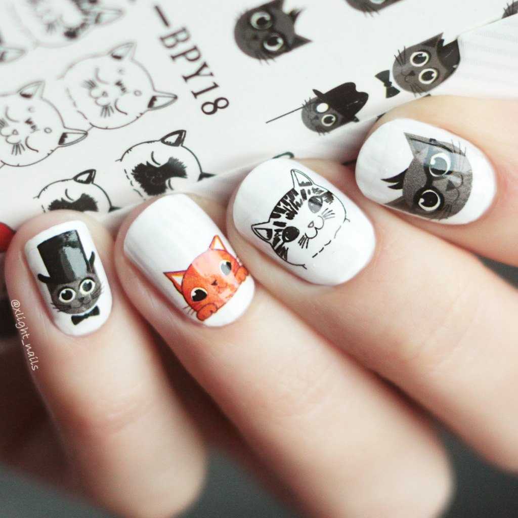 Отдельно стоит сказать о маникюре с мультяшными кошками. Например, особой популярностью пользуется изображение Чеширского кота или его улыбки. Еще интересные варианты — кот из мультика про Шрека или из мема про самого грустного кота в мире. Выбирайте любимый персонаж и переносите его на ноготки и ваш маникюр будет уникальным и привлекательным.