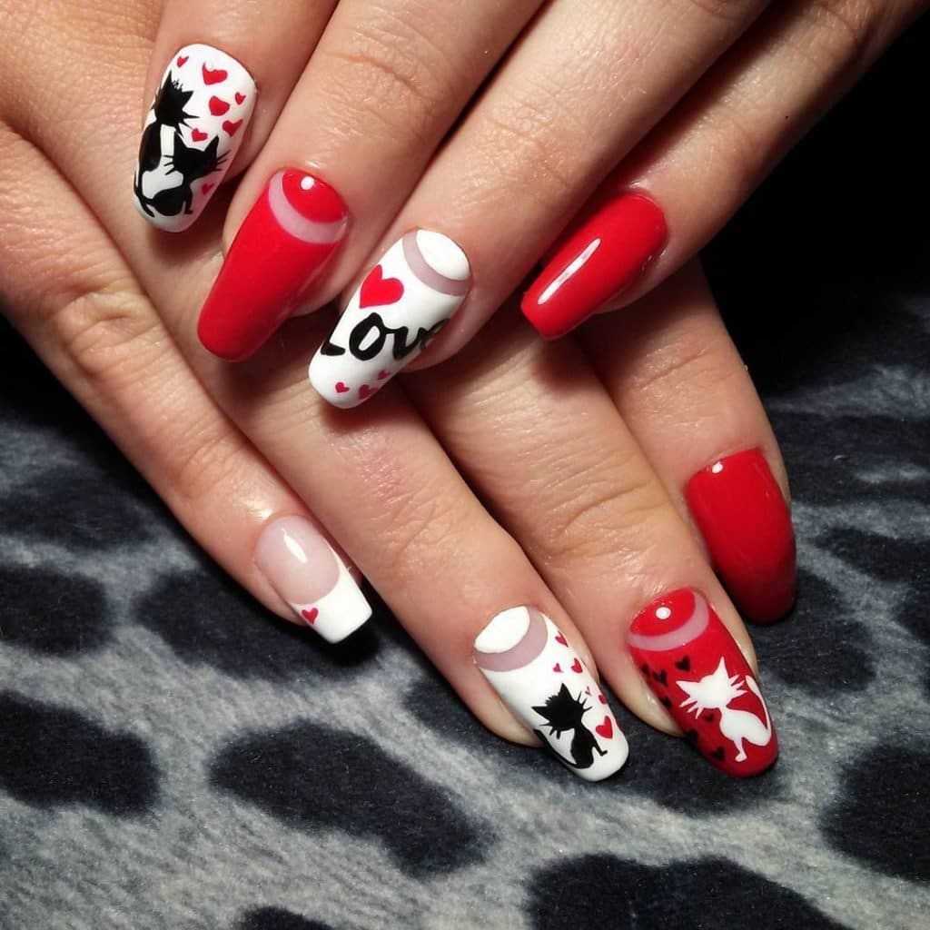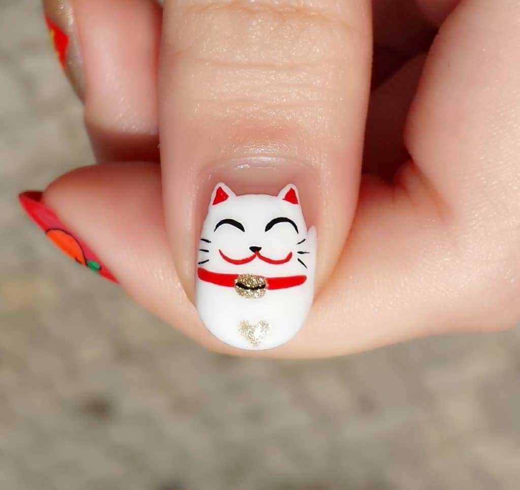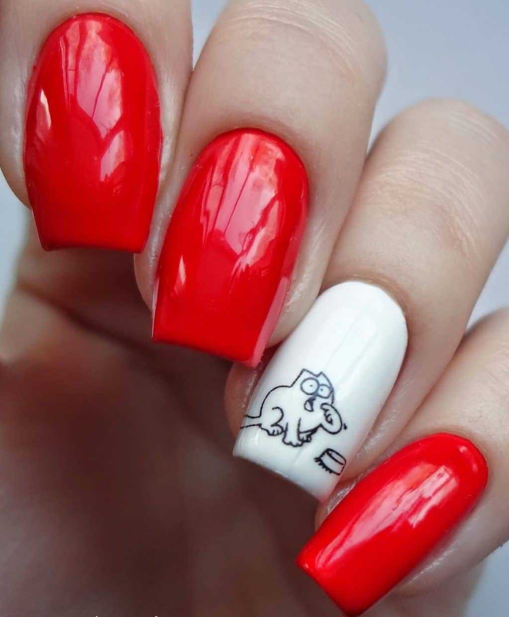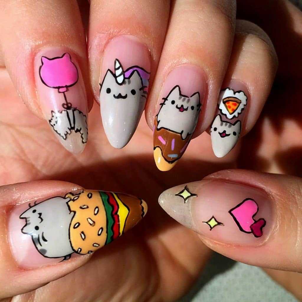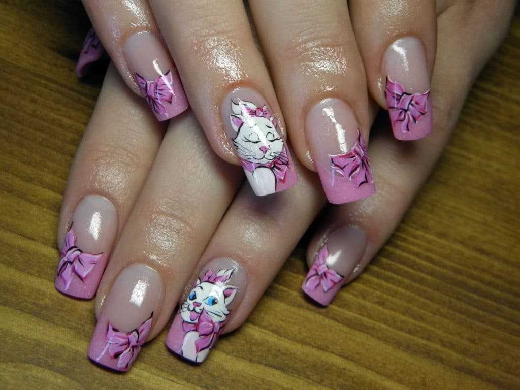 Отдельно стоит сказать о маникюре с мультяшными кошками. Например, особой популярностью пользуется изображение Чеширского кота или его улыбки. Еще интересные варианты — кот из мультика про Шрека или из мема про самого грустного кота в мире. Выбирайте любимый персонаж и переносите его на ноготки и ваш маникюр будет уникальным и привлекательным.