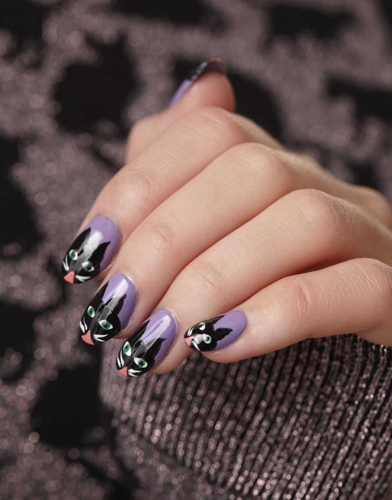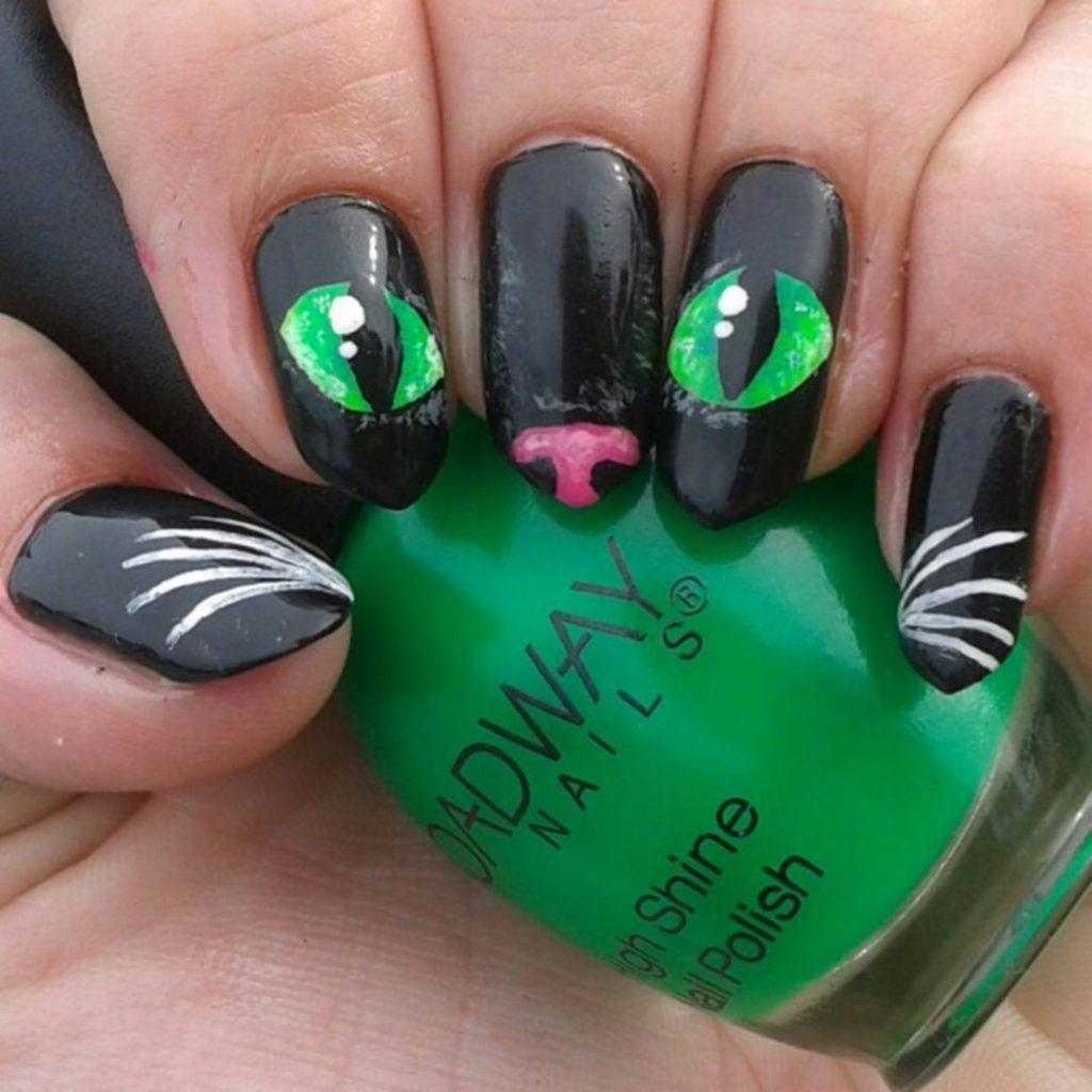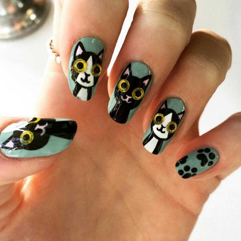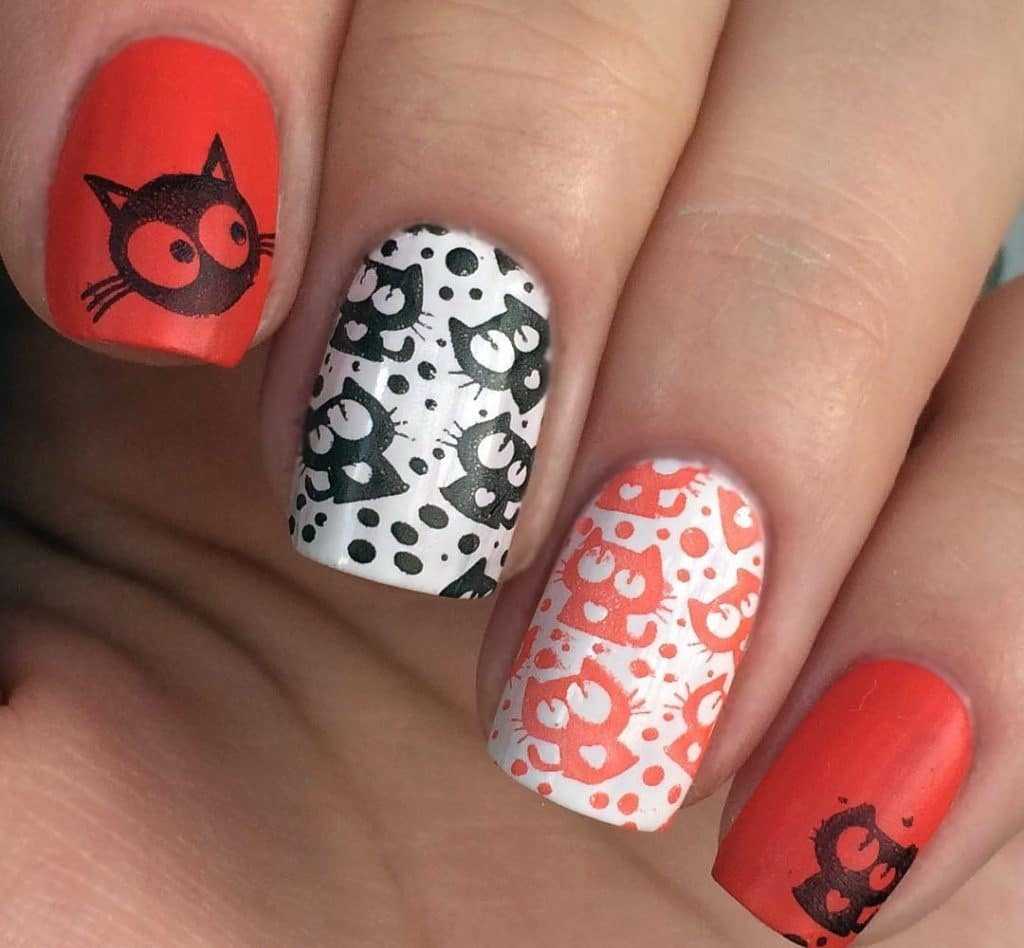 - Используйте для каждого кота разный лак, например, на первом ногте изобразите кошку красного цвета с зелеными глазами, на втором ногте – голубую кошку с зелеными глазами и та далее.
