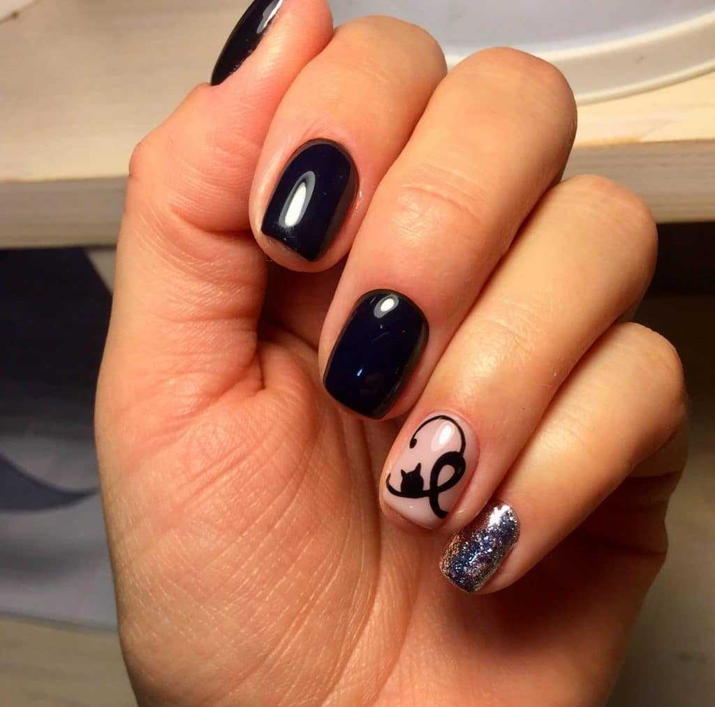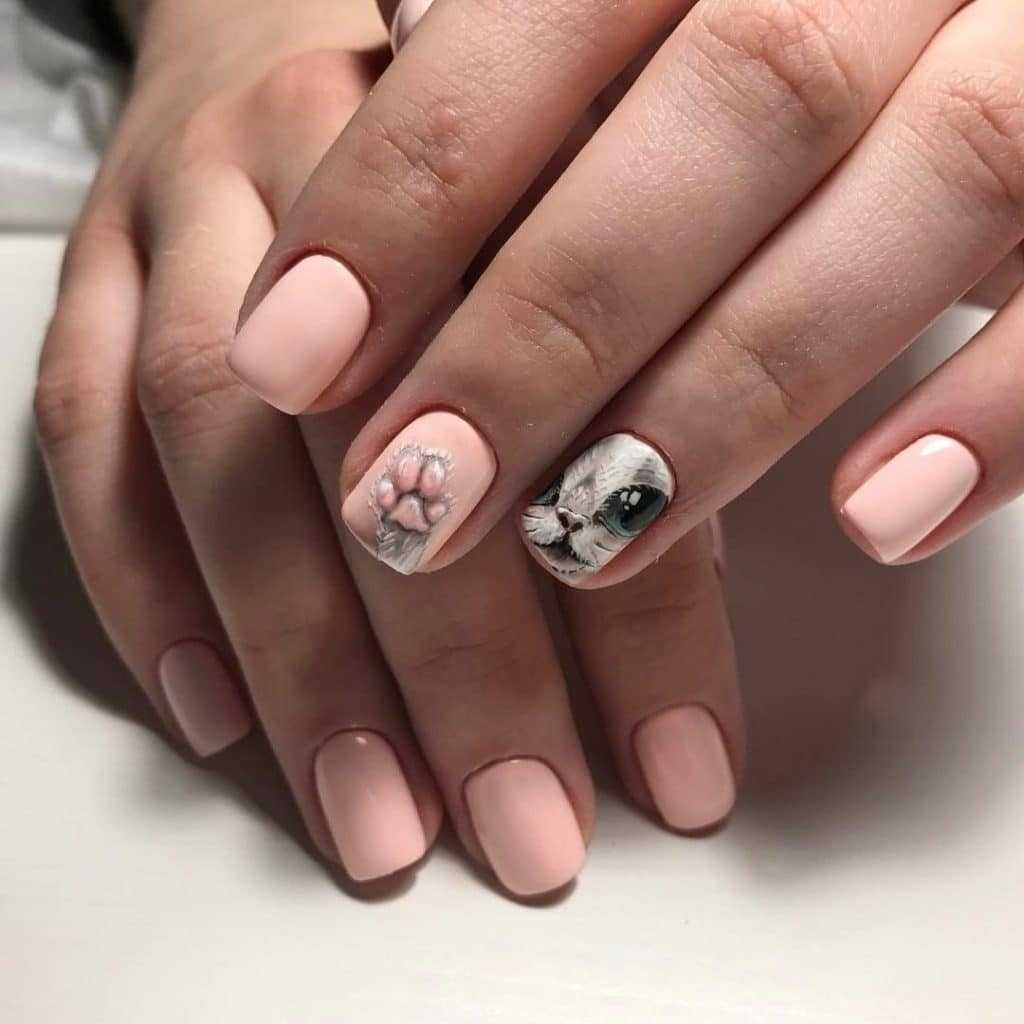 Даже на такой длине можно сделать модный дизайн. Главное – правильно подобрать размер и форму рисунка, декора. В данном случае рекомендуем не делать изображение кошки слишком крупным. Хорошей альтернативой будет ее силуэт, а также мордочки или лапки. Такой дизайн смотрится особенно мило на коротких ноготках.