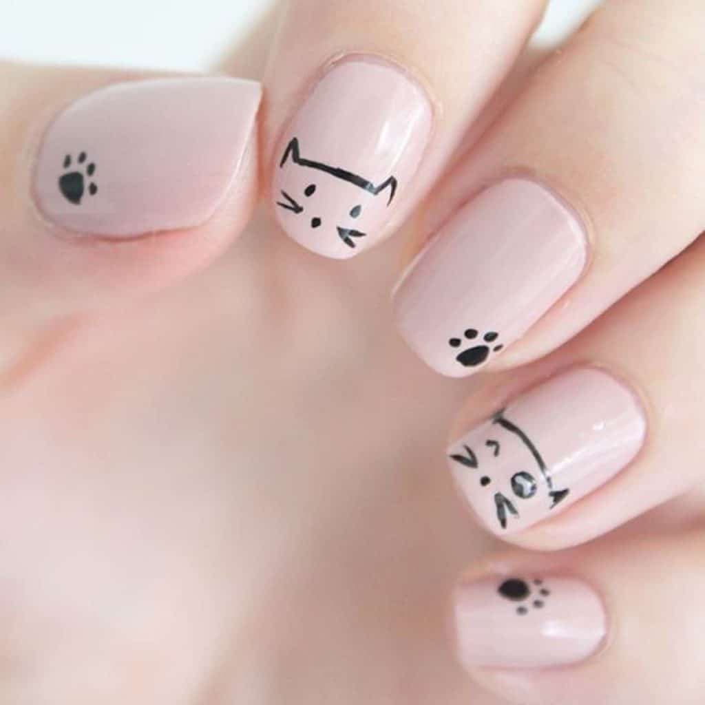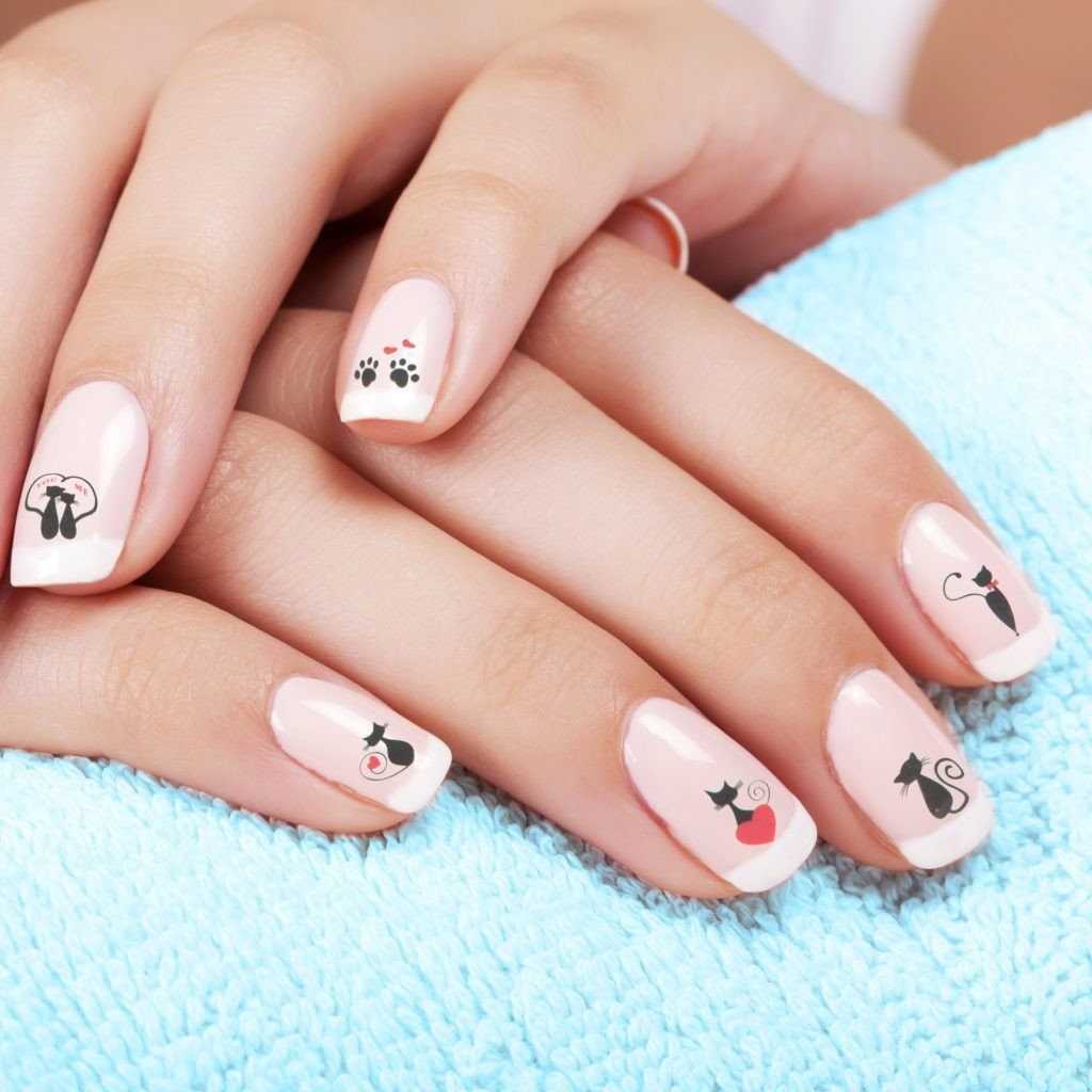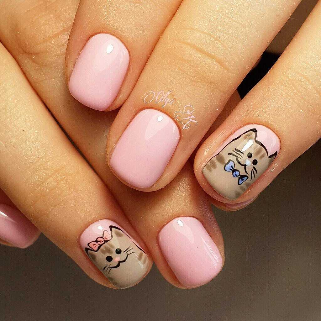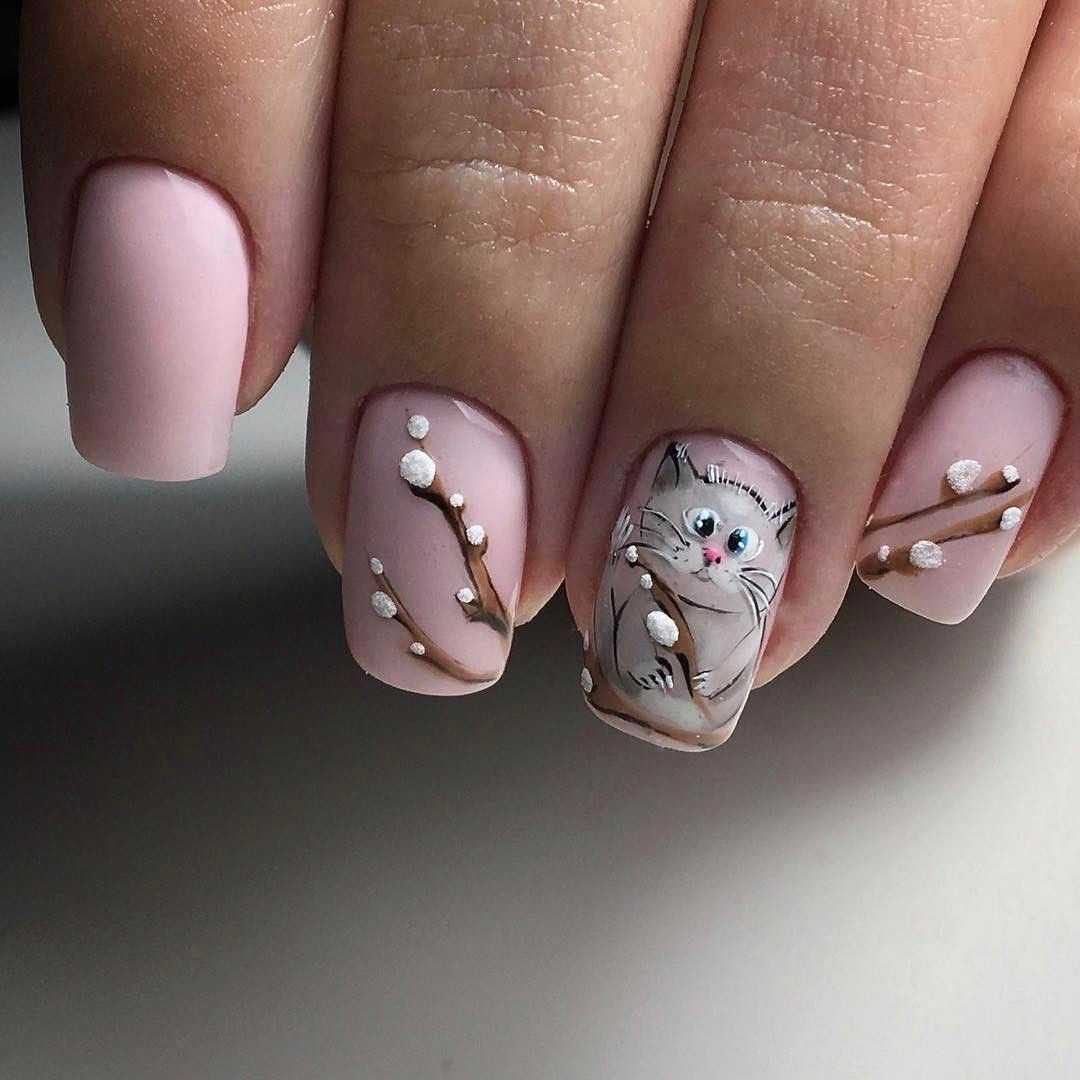 - Нежный и воздушный френч в пудровом тоне с игривыми котятами и отпечатками кошачьих лапок.
