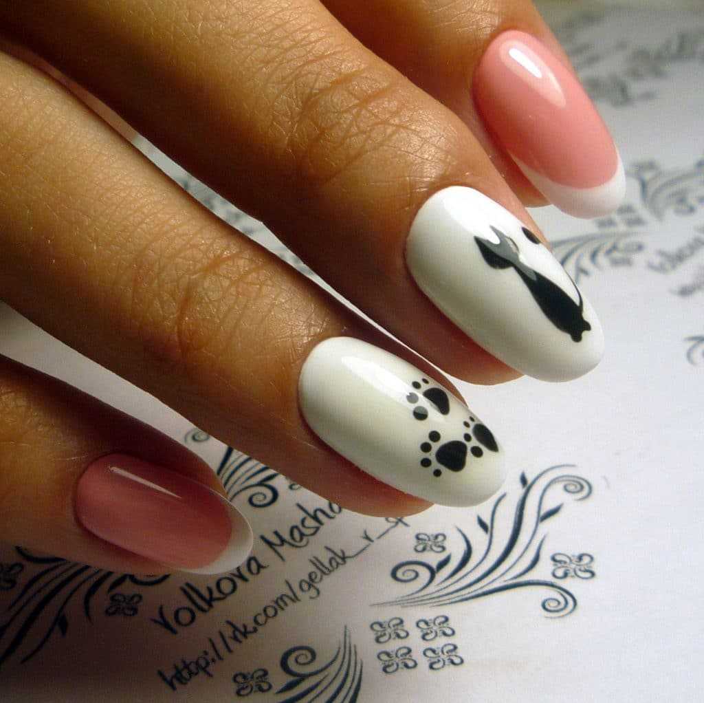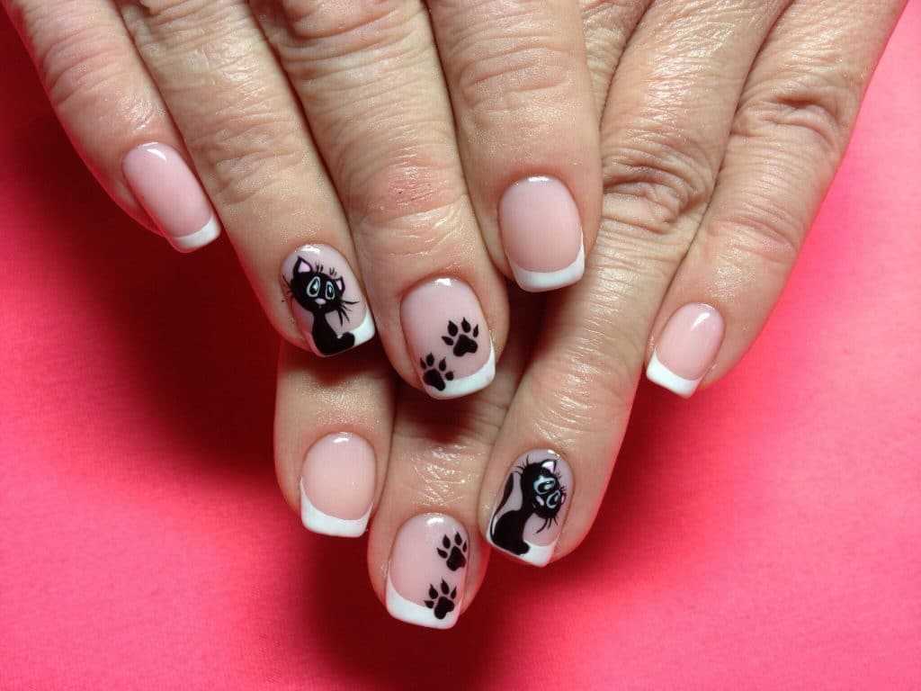 Очень необычно и здорово выглядит французский маникюр с рисунком – кошечкой. Это нежно и грациозно, полностью в стиле прекрасных и гордых животных