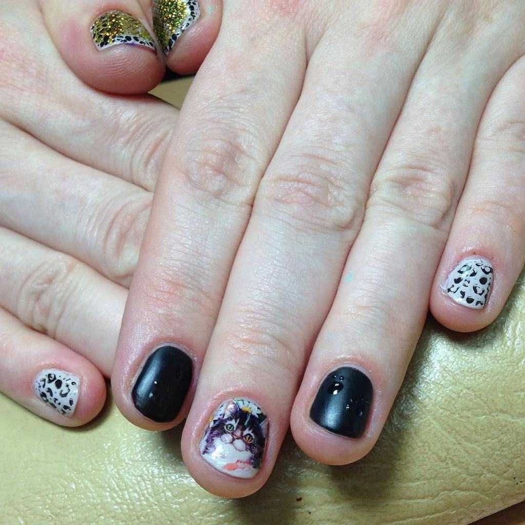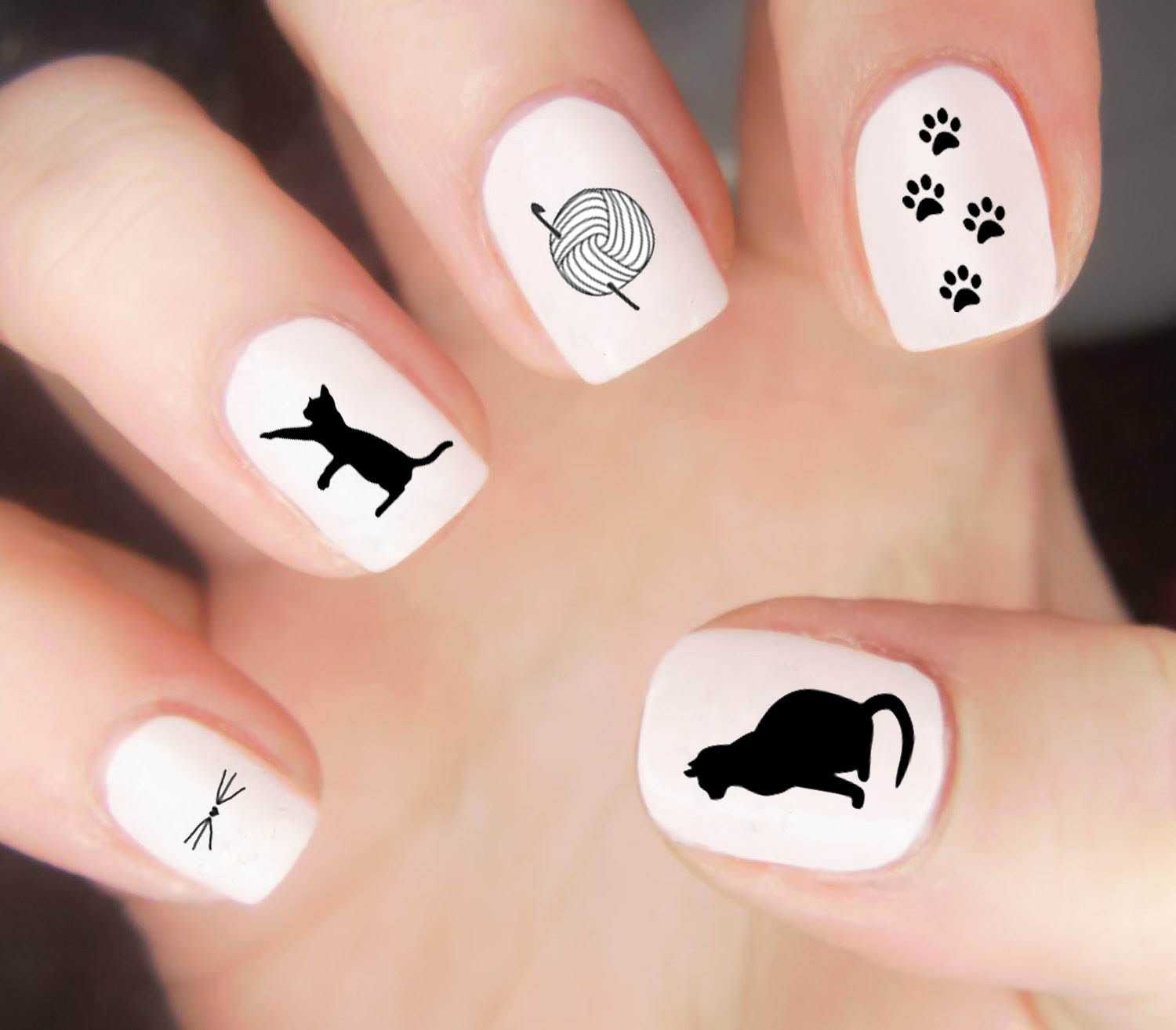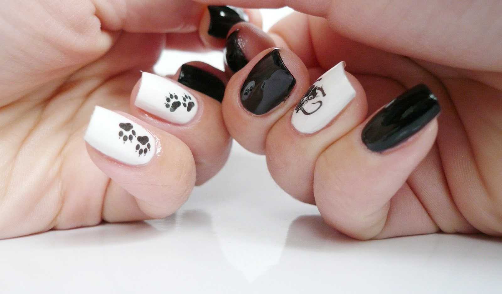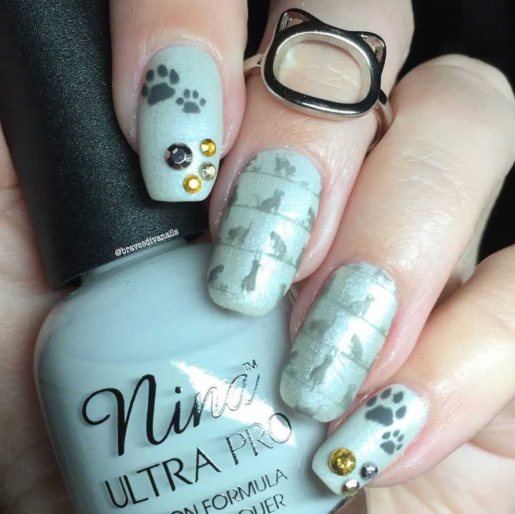 Кстати, вы всегда можете сочетать несколько рисунков. Например, кошачьи следы или рисунок лапок и силуэт животного. Чаще всего рисунки размещают на разных ноготках.
