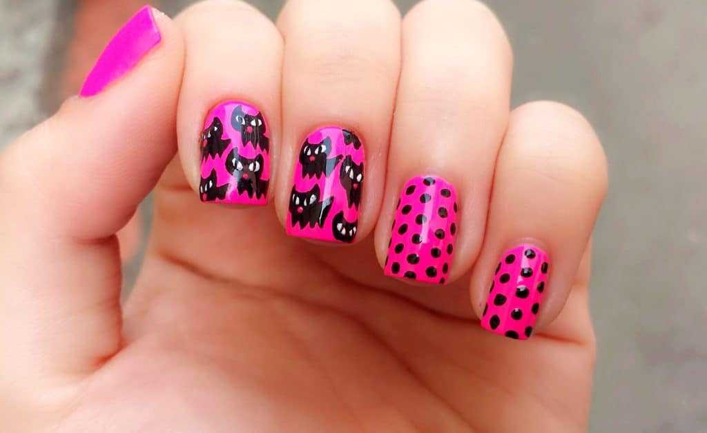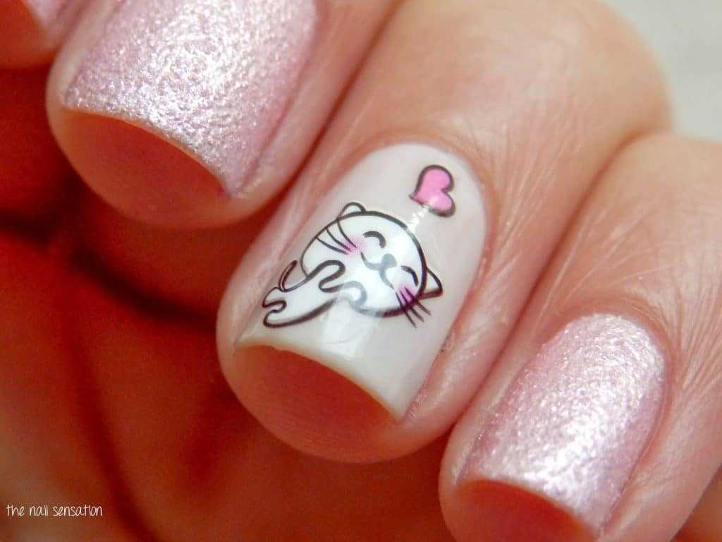 - «Зефирное» оформление ногтей в бело-розовых тонах с забавными котятами и горошком.