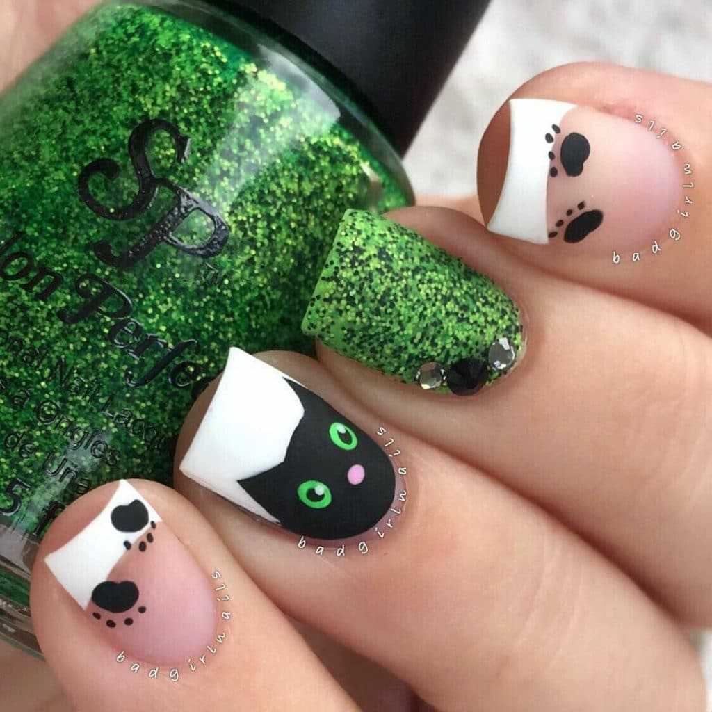 Хотите добавить рисунку кошки немного блеска? Просто используйте стразы или блестки. Например, можно сделать яркими глаза животного или выделить мелкими камнями ошейник, другие детали. Только не перестарайтесь. Вся прелесть такого дизайна в его уверенности и мимишности кошки. Не стоит перебивать эффект ярким и чрезмерным блеском.