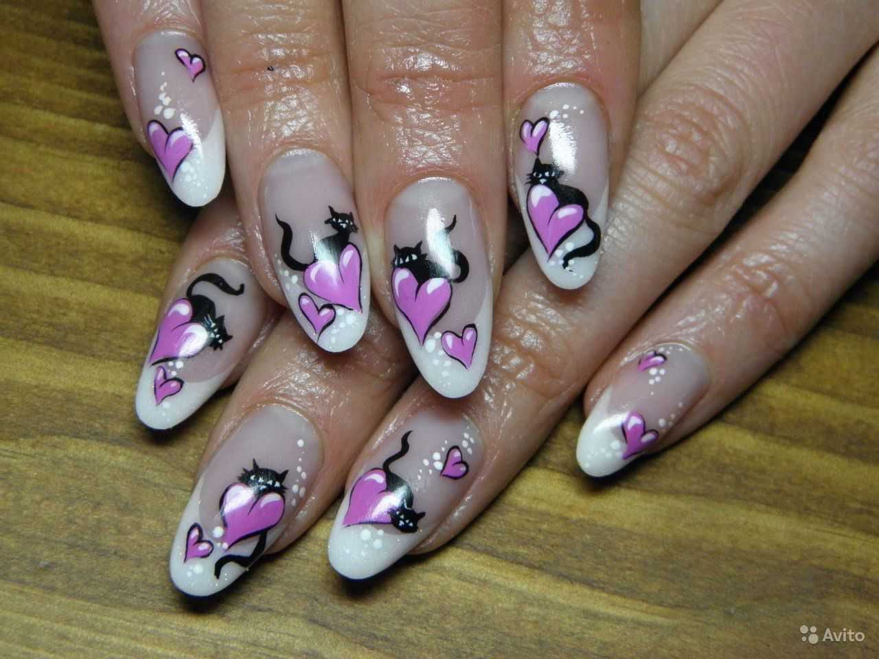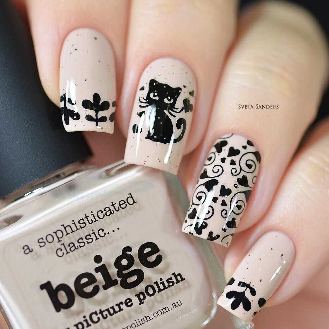 Мы уже отмечали, что маникюр с кошкой успешно сочетается практически с любыми техниками и вариантами декора. Хотя сам по себе, например, молочный или бежевый маникюр с рисунком кошки — милый и очень модный. Но если вам хочется сделать дизайн более разнообразным, рассмотрите варианты, описанные ниже.