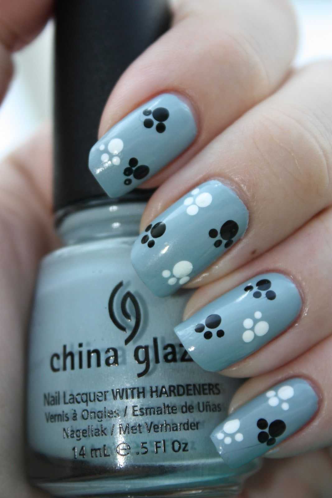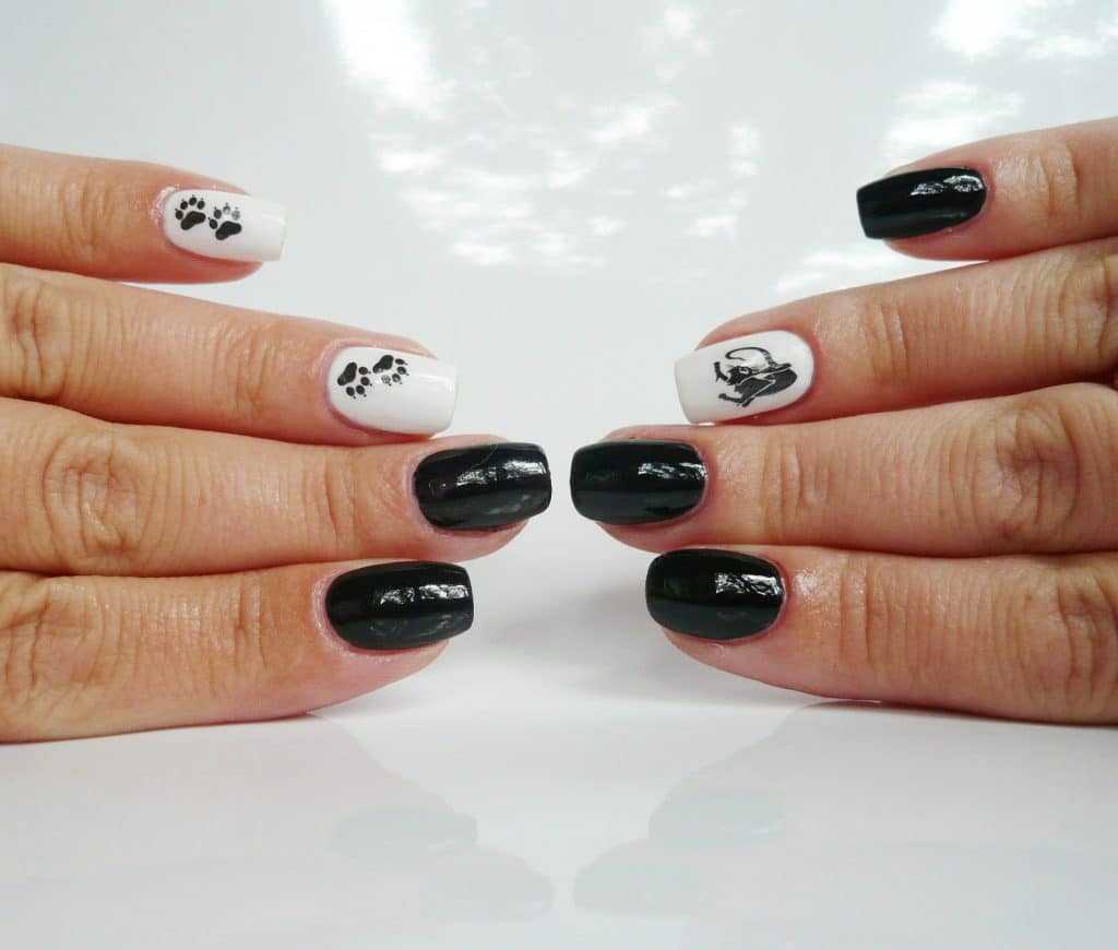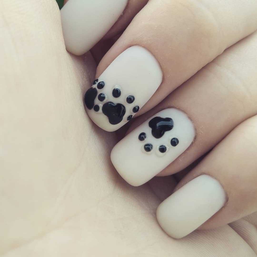 Самый простой вариант кошачьего маникюра. Лапки или следы от них пользуются популярностью как у молодых девчонок, так и дам постарше. Считается, что такой дизайн указывает на независимый характер животного, которое ходит где-то само по себе, оставив лишь следы мягких лапок. Если хочется сделать кошачий маникюр, но на салон нет времени, выбирайте рисунок лапок. Его очень просто сделать самостоятельно в домашних условиях.