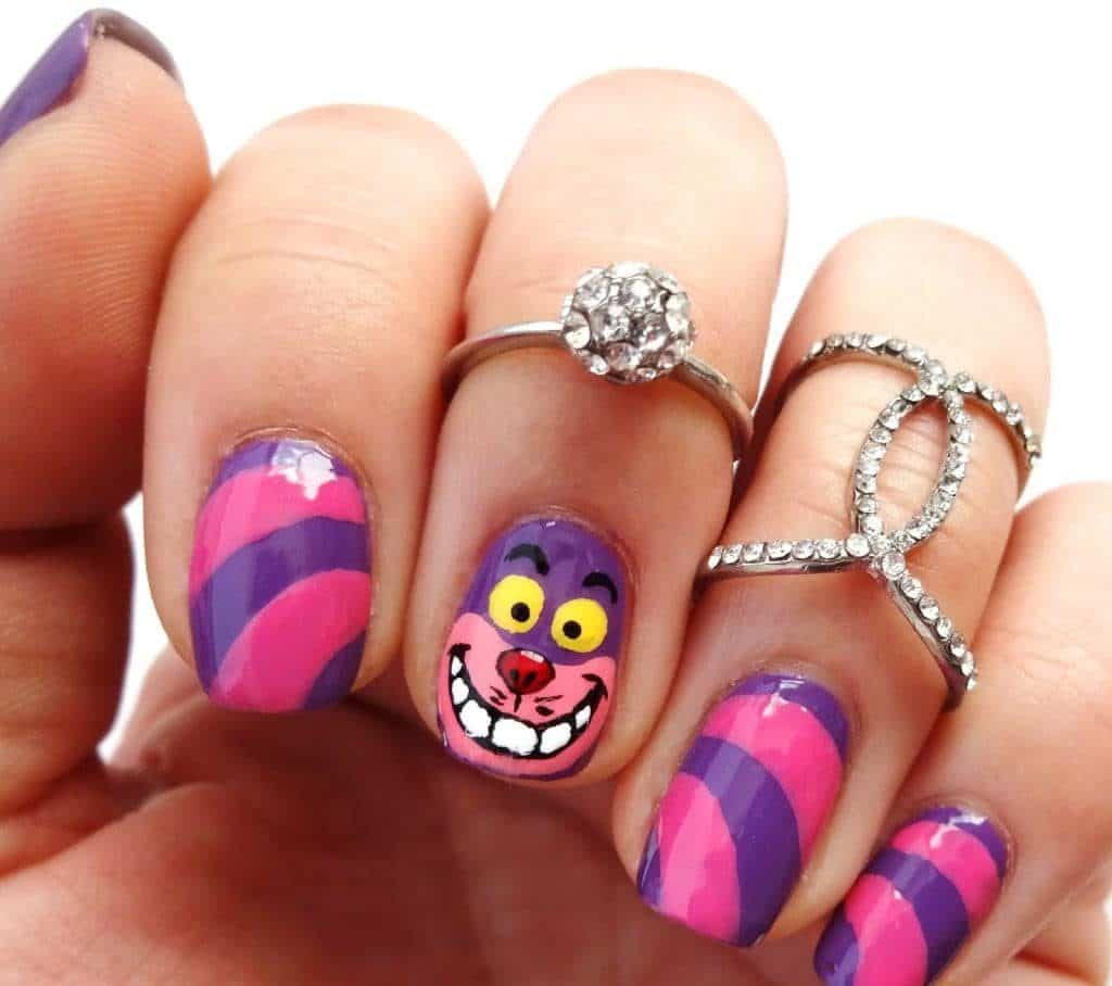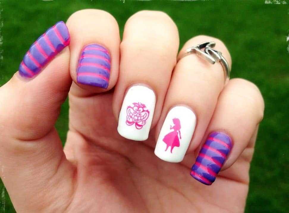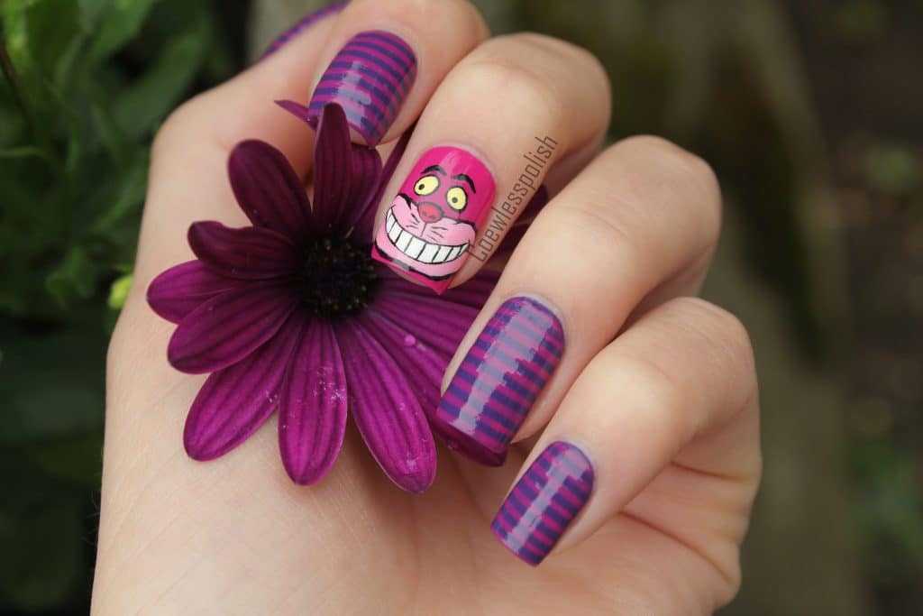 Относительно чеширского кота стоит отметить, что рисовать его самостоятельно под силу профессионалу маникюрного салона. Если подобных навыков нет, а данная тематика принципиальна, лучше купить готовые наклейки с тематикой мультфильма и изображением знакомого улыбающегося кота с его чертами и приклеить на ноготь красивый принт.