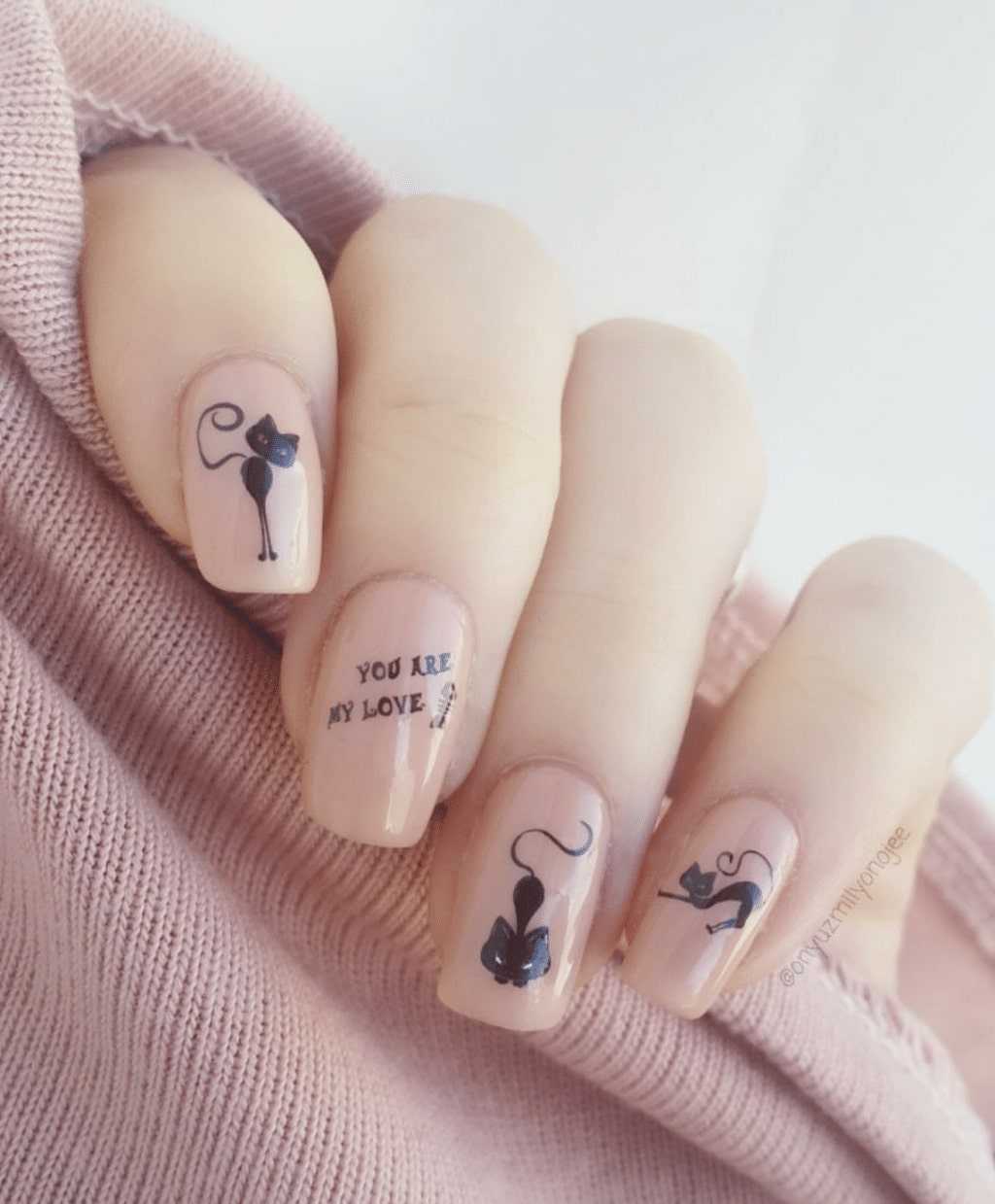 Если своя природная форма ногтевых пластин удлиненная, на ногте хватит места и для милого котика, и для открытого фона, что тоже очень важно, иначе дизайн грозится потерять выразительность. Очень красиво будут смотреться кошки на ногтях средней длины со скругленным или прямым краем