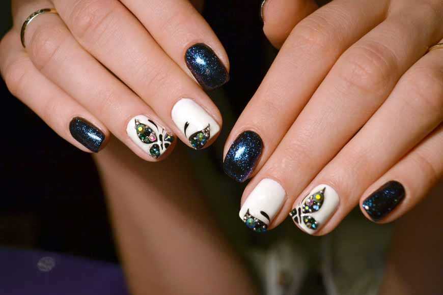 Конечно бабочка – это яркое насекомое и его изображение на ногтях не требует лишних дополнений. Но для создания торжественного маникюра дополнения в виде страз лишними не будут. При этом крылышки бабочки переливаются кристаллическим сиянием, оживают и выглядят по-новому. В зависимости от желания можно с помощью разноцветных камней изобразить бабочку полностью. А для получения более нежного рисунка украсьте переливающимися стразами отдельные части или участки рисунка. Маникюр с бабочками, украшенный стразами, смотрится потрясающе красиво и привлекательно. Но такой маникюр необходимо носить аккуратно, и он обязательно требует дополнительного закрепления.