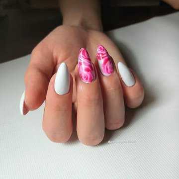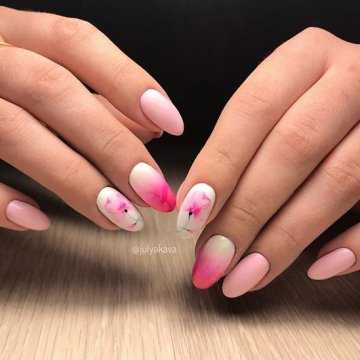 - Рисунок по мокрому гелю. Техника рисования по непросохшему гелю позволяет создать оригинальный рисунок. Визуально изображение получается объемным со слегка расплывчатым контуром, поэтому смотрится композиция нестандартно и стильно. Такой дизайн сам по себе довольно привлекательный, поэтому нет необходимости дополнять его декором.