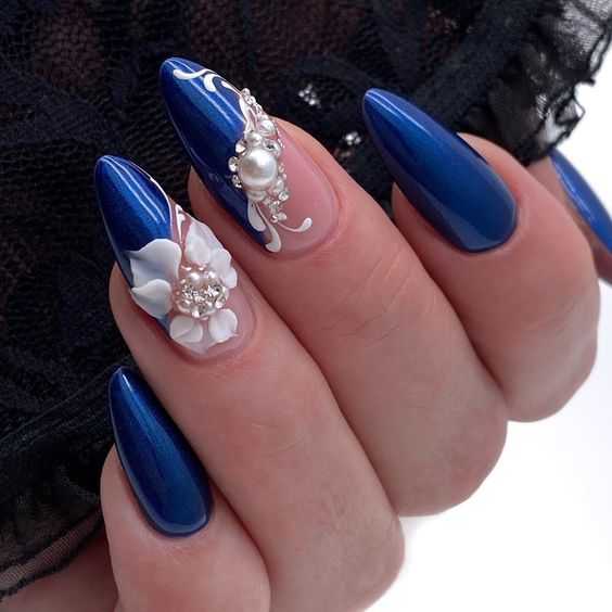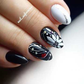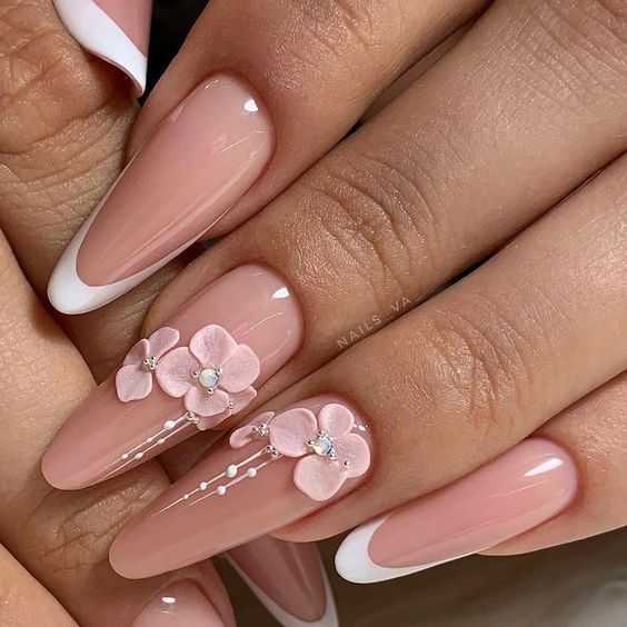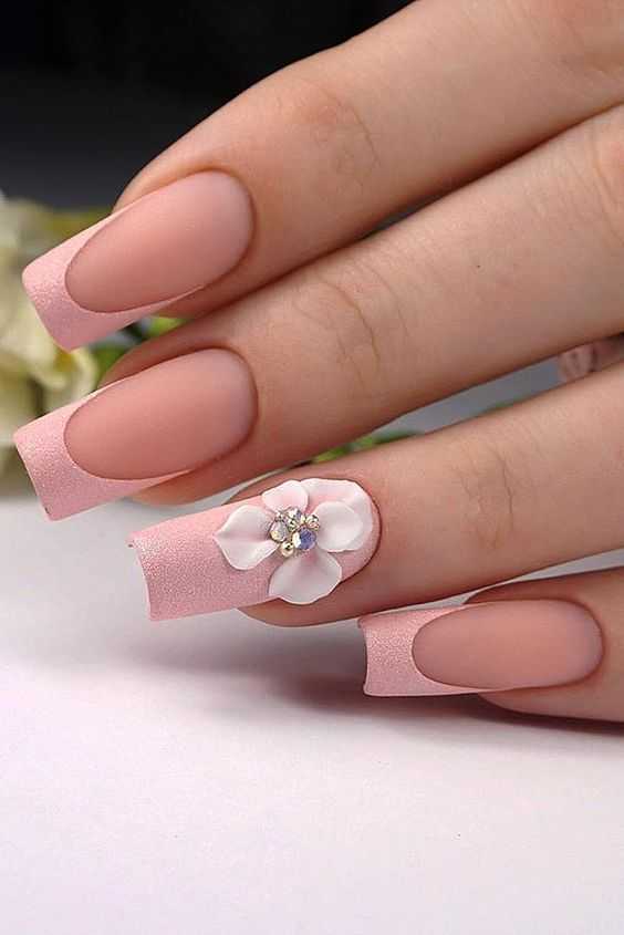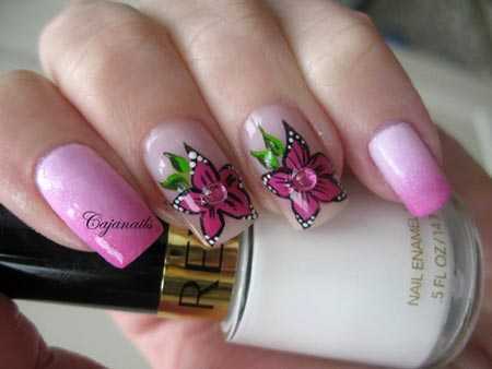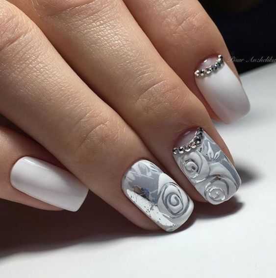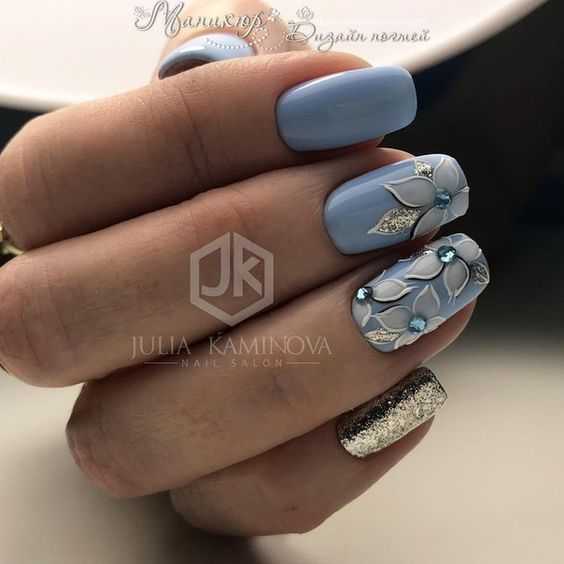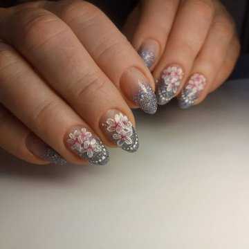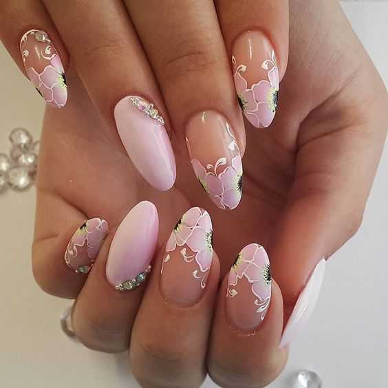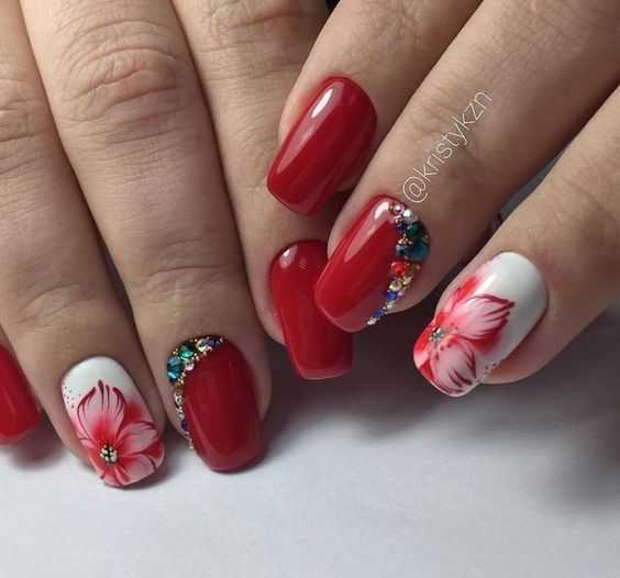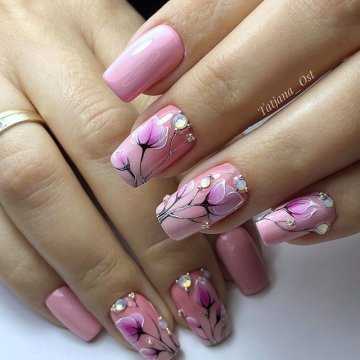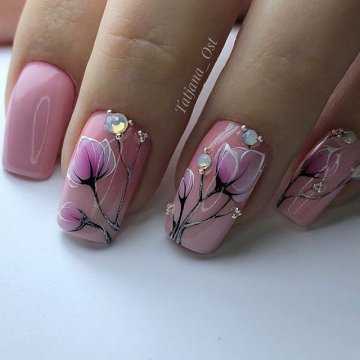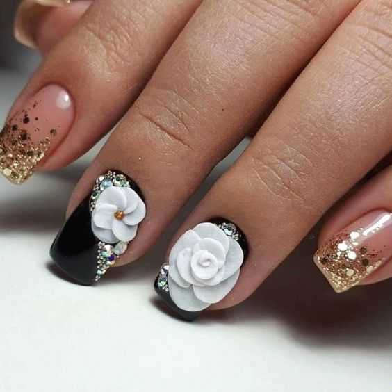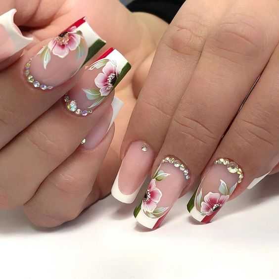 Маникюр с цветами и дополнительным дизайном: стразы, блестки, камни