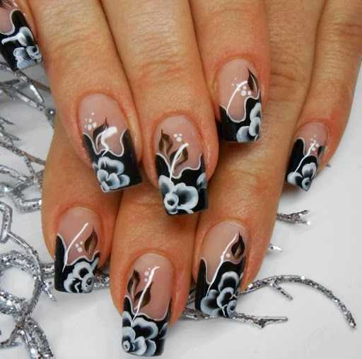Для декорирования френча используется орнамент не только в виде цветов нежных оттенков, но и темных тонов. Тренд цветочного френча — это идеально выполненная «улыбка» на ногтях с элементами цветочного принята.