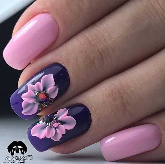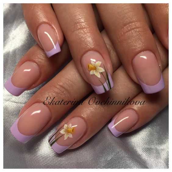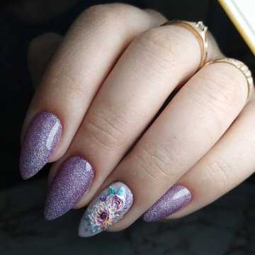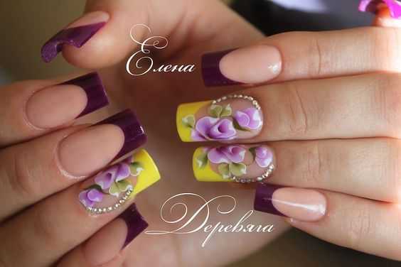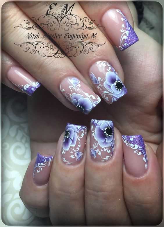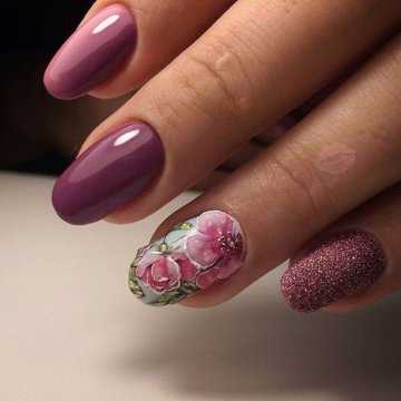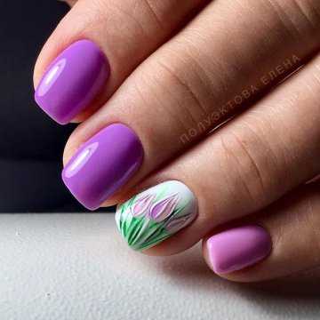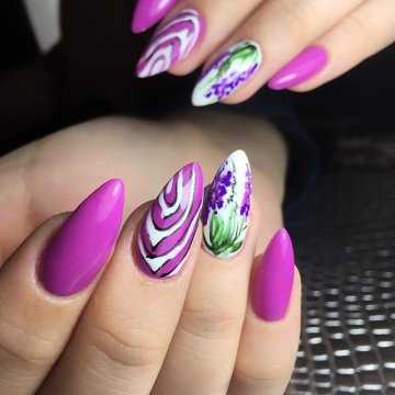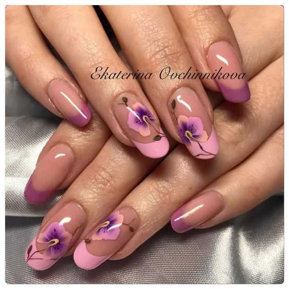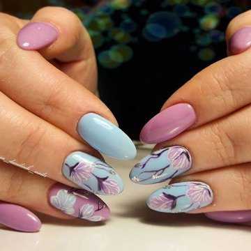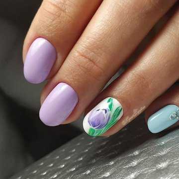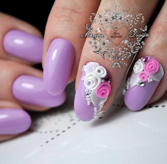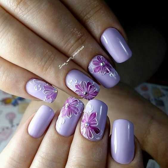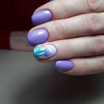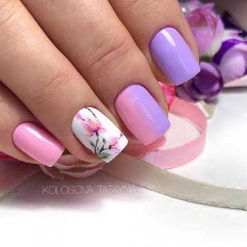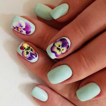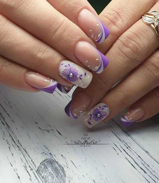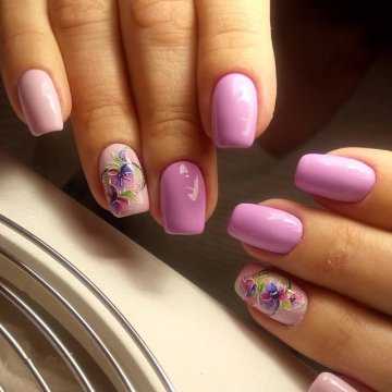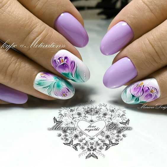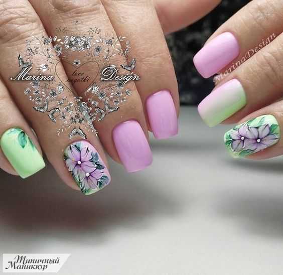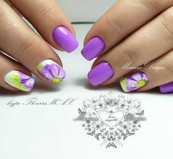 Лиловый маникюр с цветами возможно создать благодаря сочетанию романтического тандема: розового, мятного, зеленого, лимонного и голубого цветов.