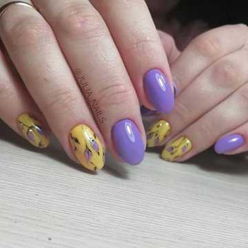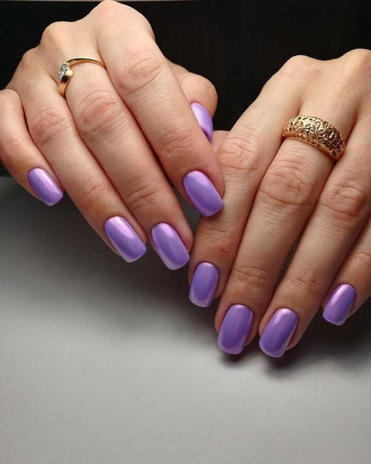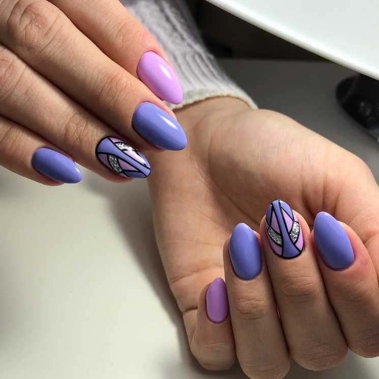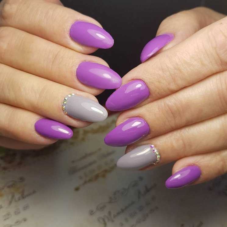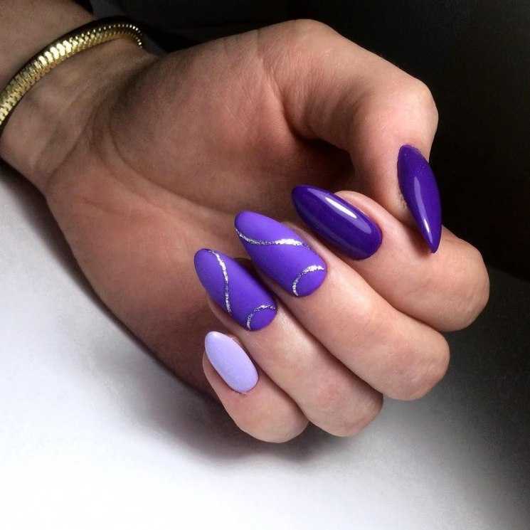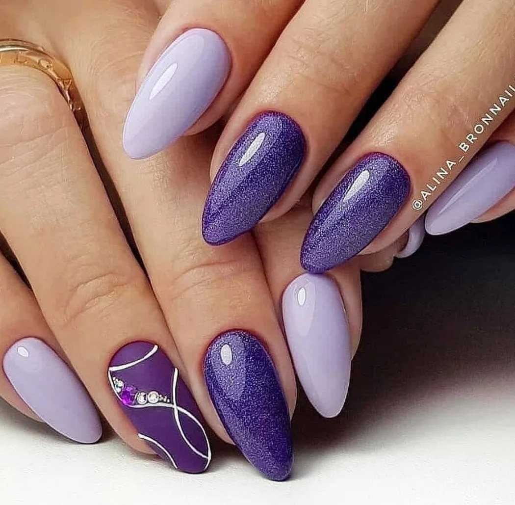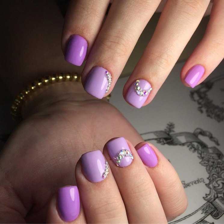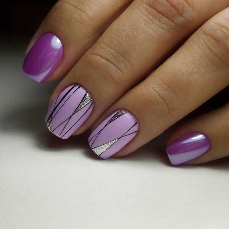Если же разбавить лиловый похожими, но более холодными оттенками, то возможно получить благородный и изысканный маникюр.