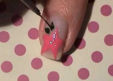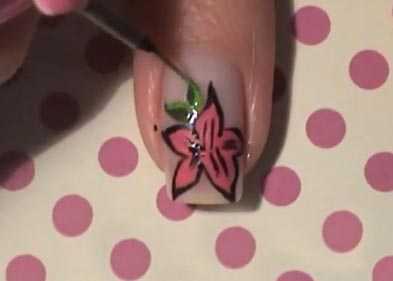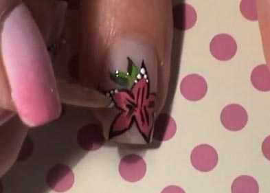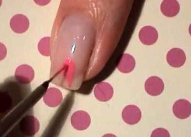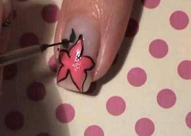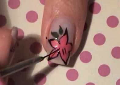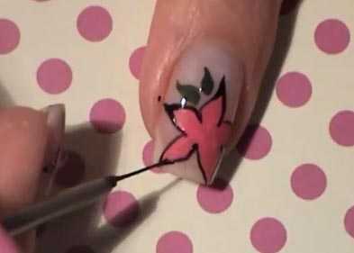Начинаем рисовать лепестки лилии акриловой краской розового цвета с помощью тонкой кисти для нейл-арта.