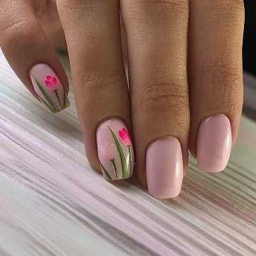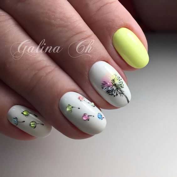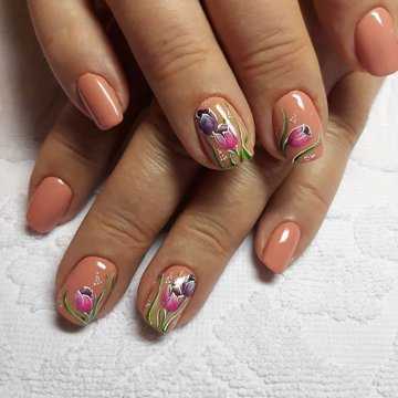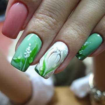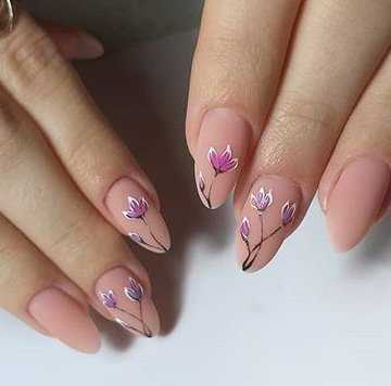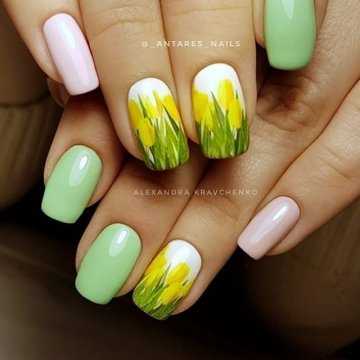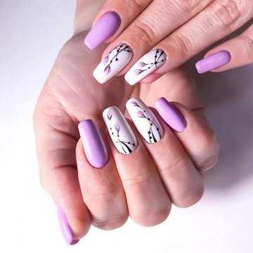 • Маникюр «сакура» — на момент начала цветения вишневых деревьев, весной, когда природа оживает после длительного зимнего периода, девушкам зачастую хочется освежить ручки ярким рисунком, созвучным с настроением и погодными условиями грядущего потепления. Розовые веточки сакуры на ноготках смотрятся невероятно тонко, изысканно и очень нежно.• Дизайн «сирень» — не менее актуален в весеннюю пору рисунок из ветвей насыщенной фиолетовой или изнеженной светлой сирени. А сочетание двух разных сортов данного растения на ноготках смотрится ещё более ярко и выразительно, нежели применение одного из них.• Нейл-арт «одуванчик» — такой маникюр больше предпочитают девушки помоложе. На короткую ногтевую пластину наносится насыщенный зеленый фон и выводятся акцентированные жёлтые головки одуванчиков. Более сдержанная вариация – применение прозрачного фона или базы в нюдовой расцветке с дальнейшим нанесением на неё пушистых головок одуванчиков. Смотрится необычно и интересно.