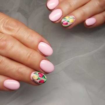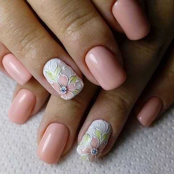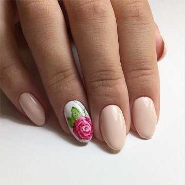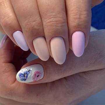 Подобный маникюр достаточно вариативен. При его создании можно использовать различные оттенки и комбинировать их. Пастельные нежные тона смотрятся красиво, женственно, мягко. Это могут быть цветы нежно-розового, персикового или белого цвета.