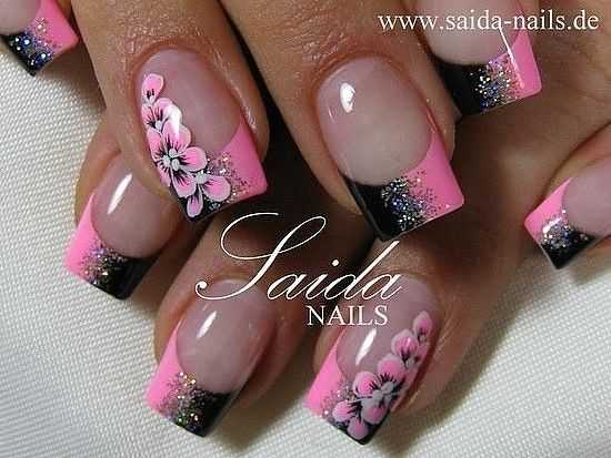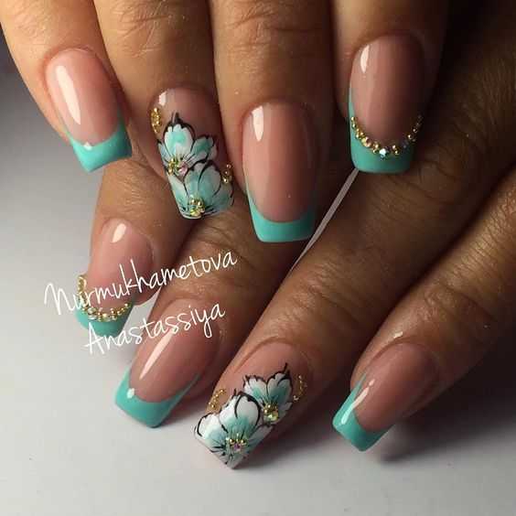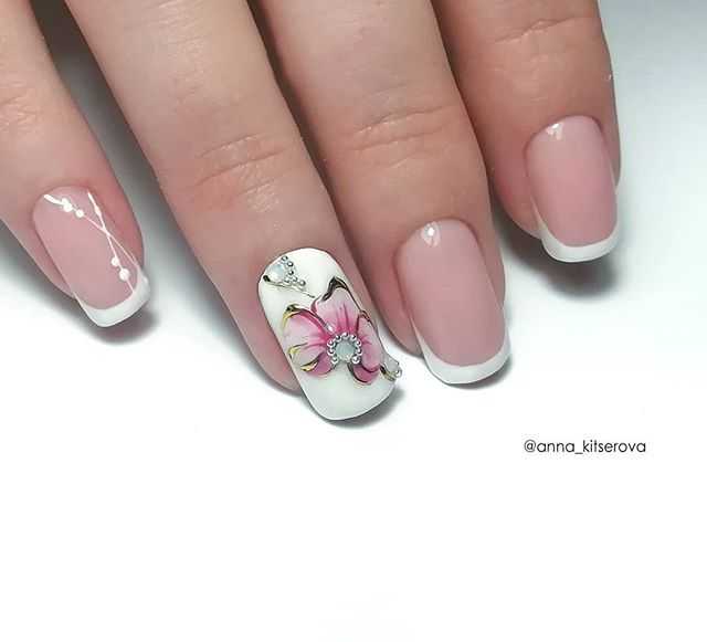 Для акцентирования внимания на ноготочках применяется французский дизайн с цветочными мотивами, блестками и стразами. Выбор вариантов для оформления топового цветочного маникюра, даже на короткие ногти, огромен!