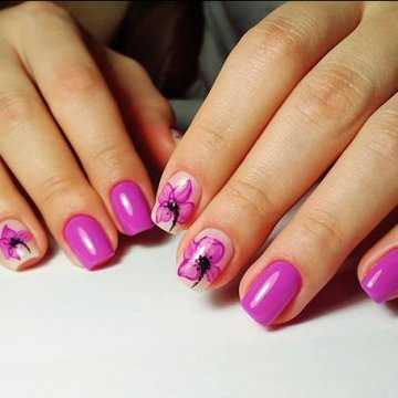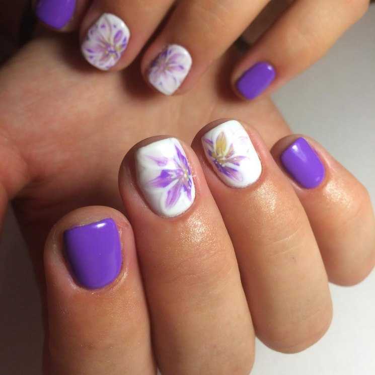 • Весенние незабудки – любительницам нежного голубого оттенка нравится сочетать бело-голубую цветовую композицию у себя на ногтях в виде высветленного фона и акцентированных цветков на некоторых отдельных ноготках.• Белоснежные лилии – отлично подходит роспись с использованием подобной флористики под безупречный нежный френч. Подобную комбинацию можно даже применить в качестве свадебного маникюра.• Лиловая орхидея – умопомрачительной красоты цветок, привлекательность которого в большей мере проявляется в различных его сортовых интерпретациях. Глубокий лиловый оттенок в особенности уместен на белом фоне: мастера маникюрного сервиса в курсе этого момента, поэтому они активно предлагают модницам именно эту модель художественной композиции. • Маковая роспись – любительницам экстравагантного красного оттенка в цветочных изображениях на ногтях нравится использовать импровизированные маковые цветки. Главным образом уместно их применять на чёрном глянцевом фоне.