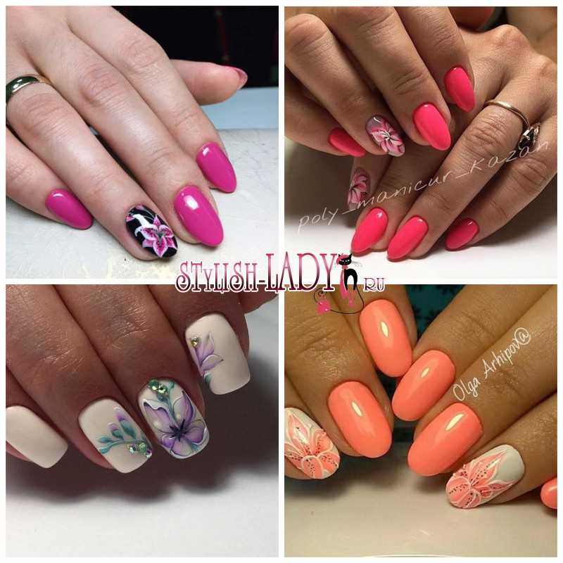 - обладательницам короткой пластины не стоит украшать яркими цветами все пальцы одновременно – вполне достаточно красивой крупной лилии на одном ногте;