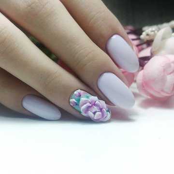 - 3D. Стильный, богатый вид имеет рельефное изображение цветка. Добиться такого эффекта можно, используя акриловую пудру и гель-лак. Нейл-арт с объемными лепестками будет не очень практичен, он подходит для вечернего выхода, праздника или какого-либо особого события, в будние дни стоит сделать дизайн проще.