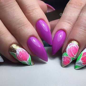 Ничто так не улучшает настроение, как цветы! Попробуйте нарисовать на ногтях розы, фиалки или лилии, опирайтесь на свой вкус. Если не использовать стемпинг, можно получить уникальный и неповторимый дизайн. Для этого не обязательно иметь длинные ногти, на родных вполне уместится один или два небольших симпатичных цветочка. На длинных ногтях вы сможете нарисовать уже более сложные и крупные узоры. Представьте, что ногтевая пластина — холст, а вы — художник, и начните претворять интересные идеи в жизнь с помощью лаков и акриловых красок.
