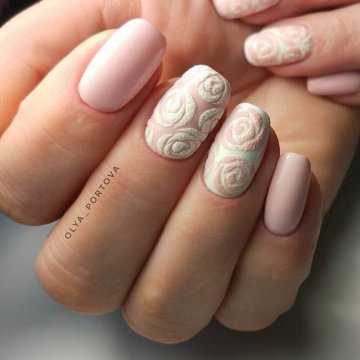 Оригинальный нейл-арт получается при создании рисунка близкого по цвету к основному фону. При этом изображение будет видно только вблизи, а издалека ногти будут казаться однотонными.