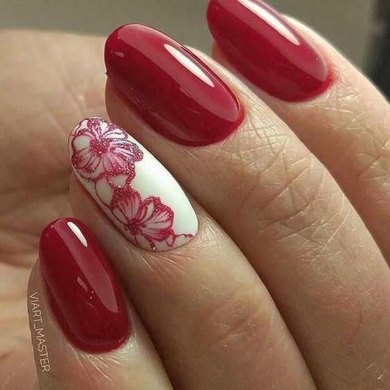 • Цветочный орнамент полукругом в зоне лунулы – такой дизайн ногтей особенно хорош при использовании идеального сочетания цветов: фиолетовый на белом, красно-зеленый на желтом, молочный на голубом.• Эффект обоев – монотонное заполнение ногтевой пластины одинаковым рисунком на каждом ноготке создает иллюзию графического цветочного эскиза на ногтях.• Гравированные розы – выбитые в качестве парчовой клади на ноготках лепестки роз, аккуратно скругленные в бутон, смотрятся поистине дорого, элитарно, аристократично.
